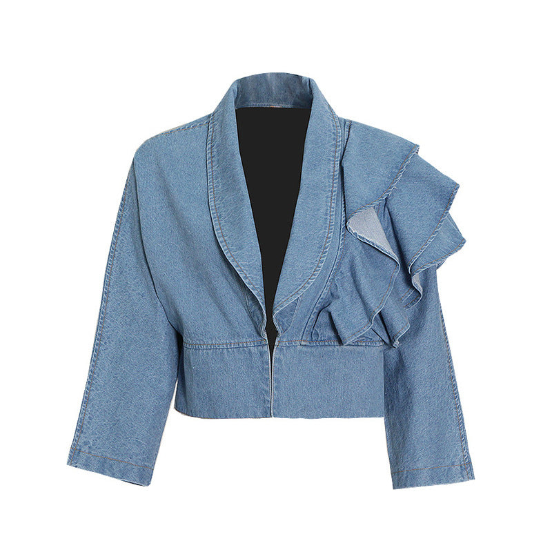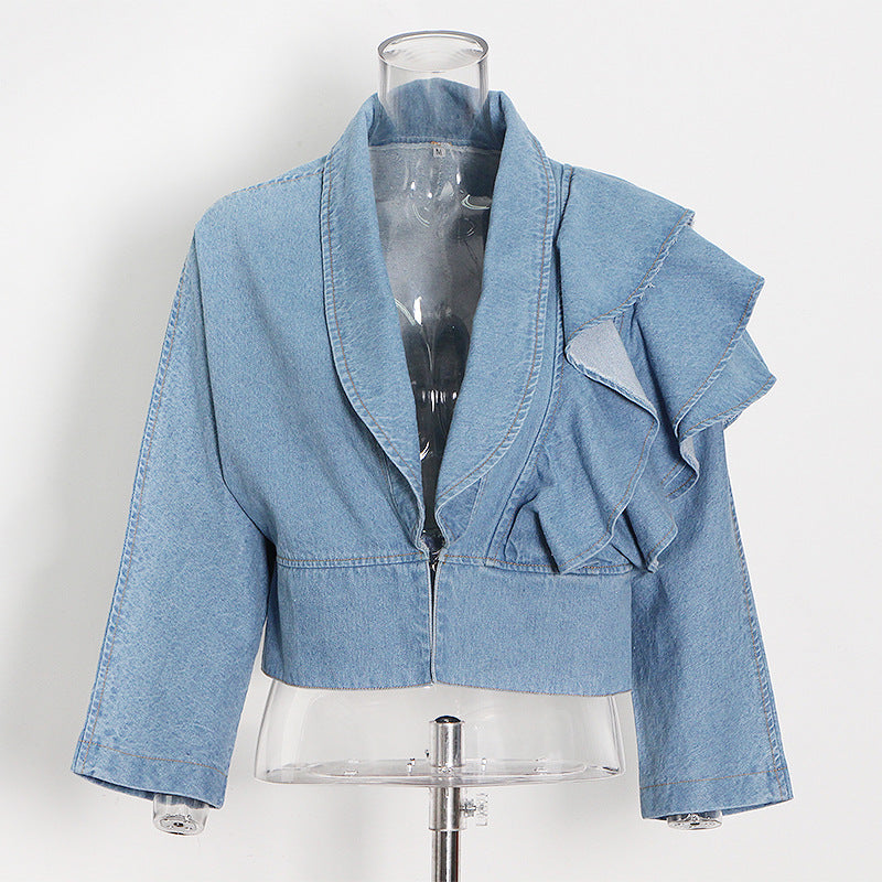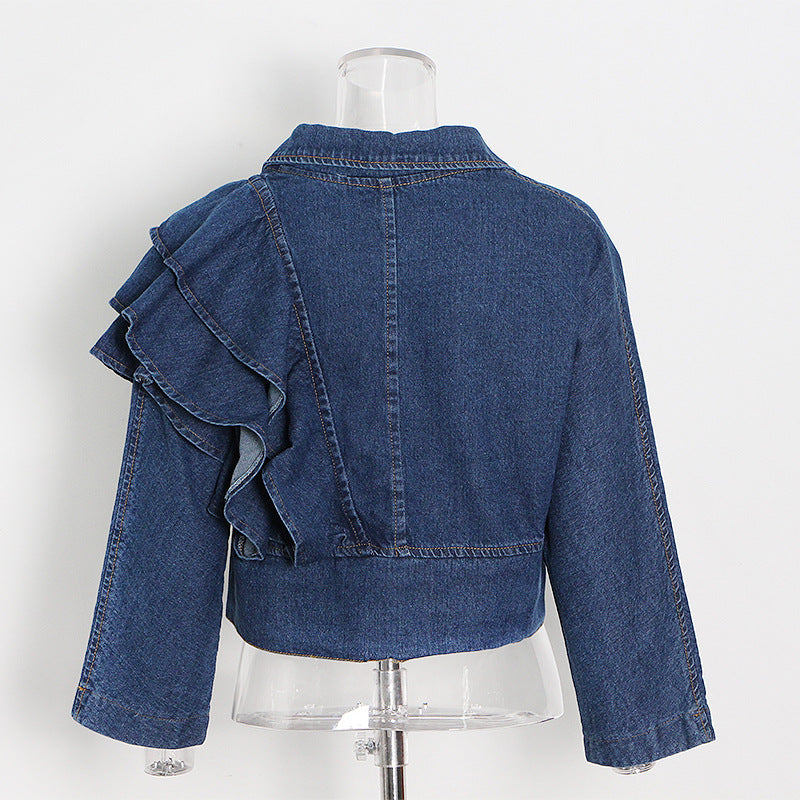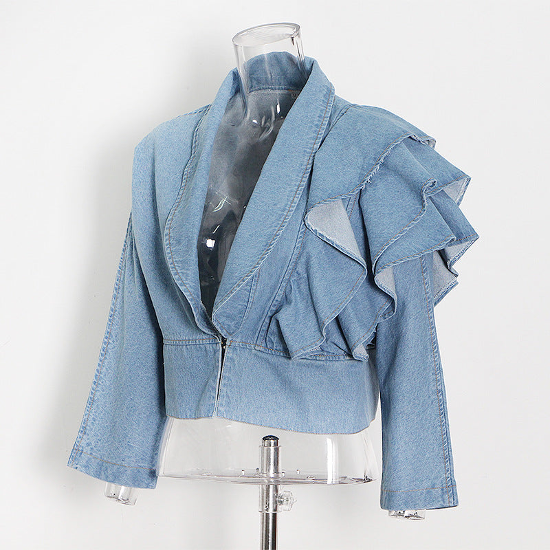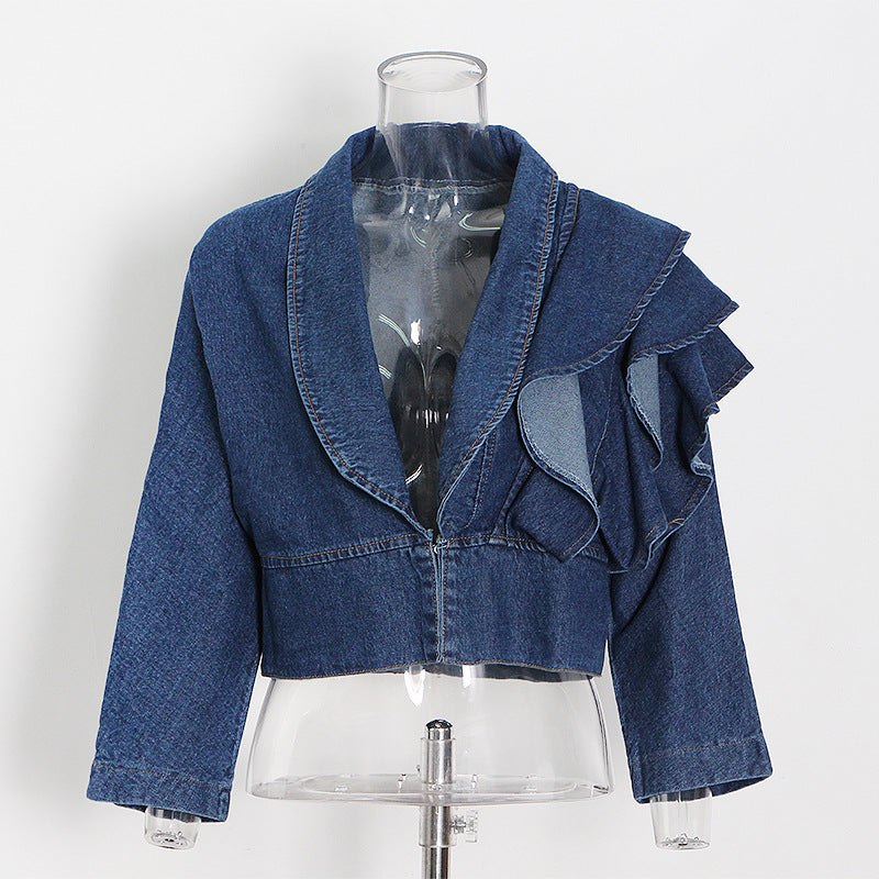 Autumn Office Niche Design Patchwork Ruffled Long Sleeve Short Women Jeans Shirt