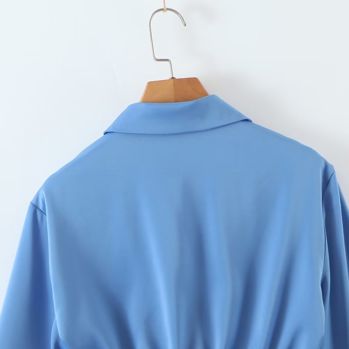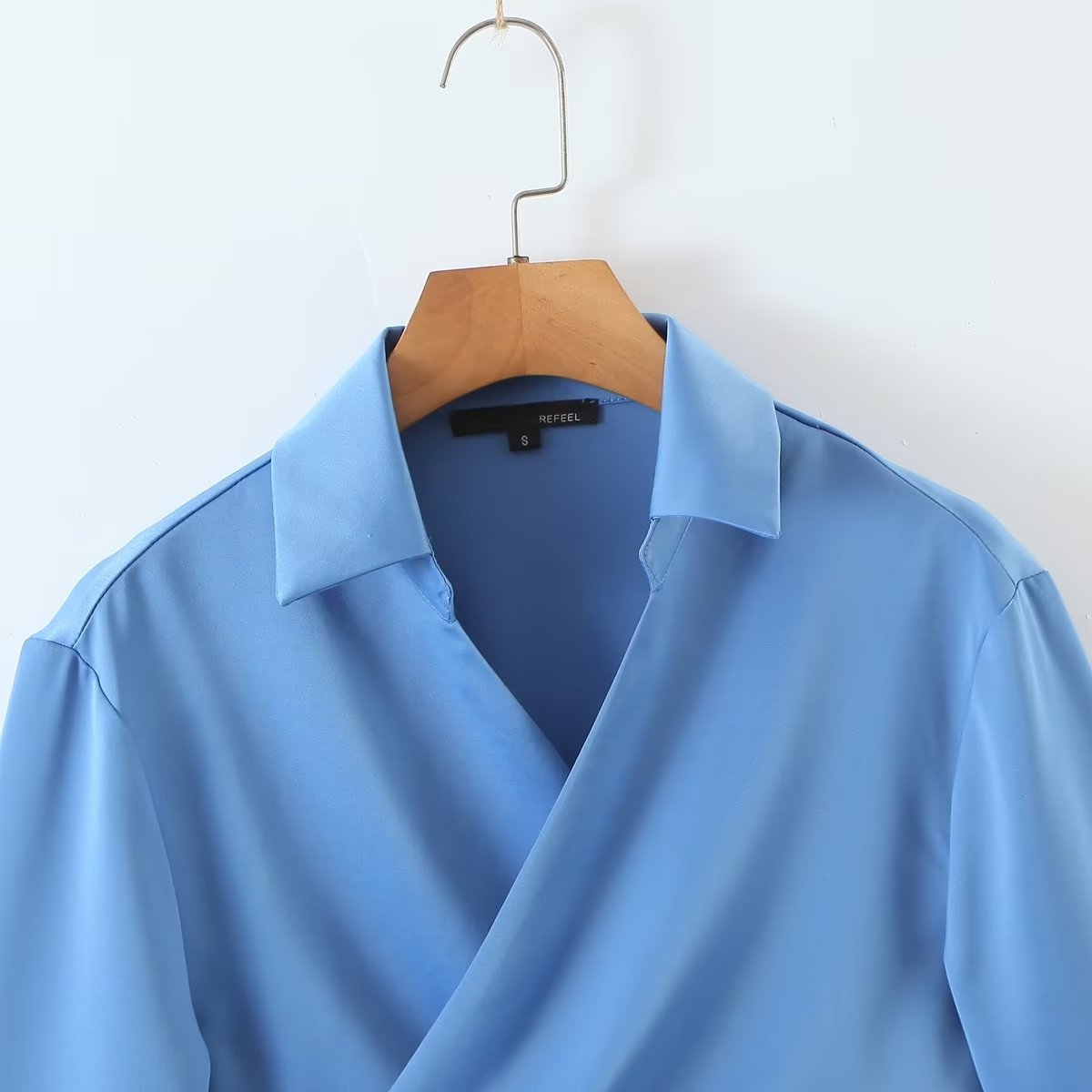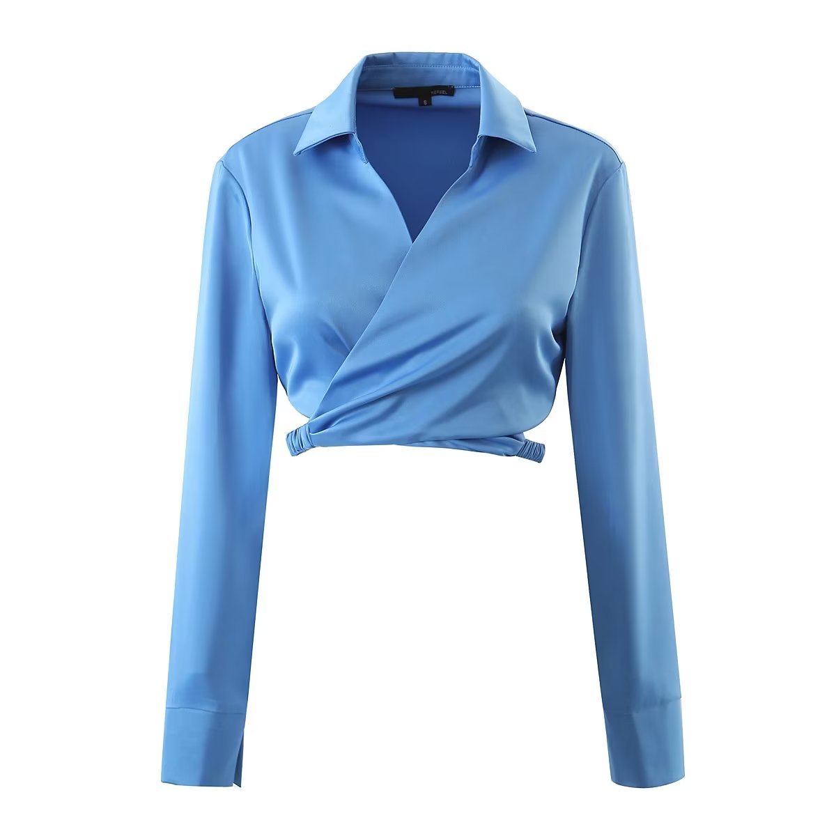Autumn Pullover Long Sleeve Collared Slim Short Cross Metal Buckle One Piece Wrap Shirt