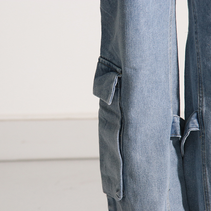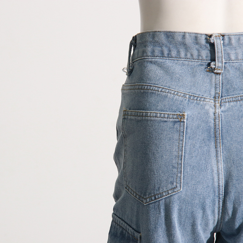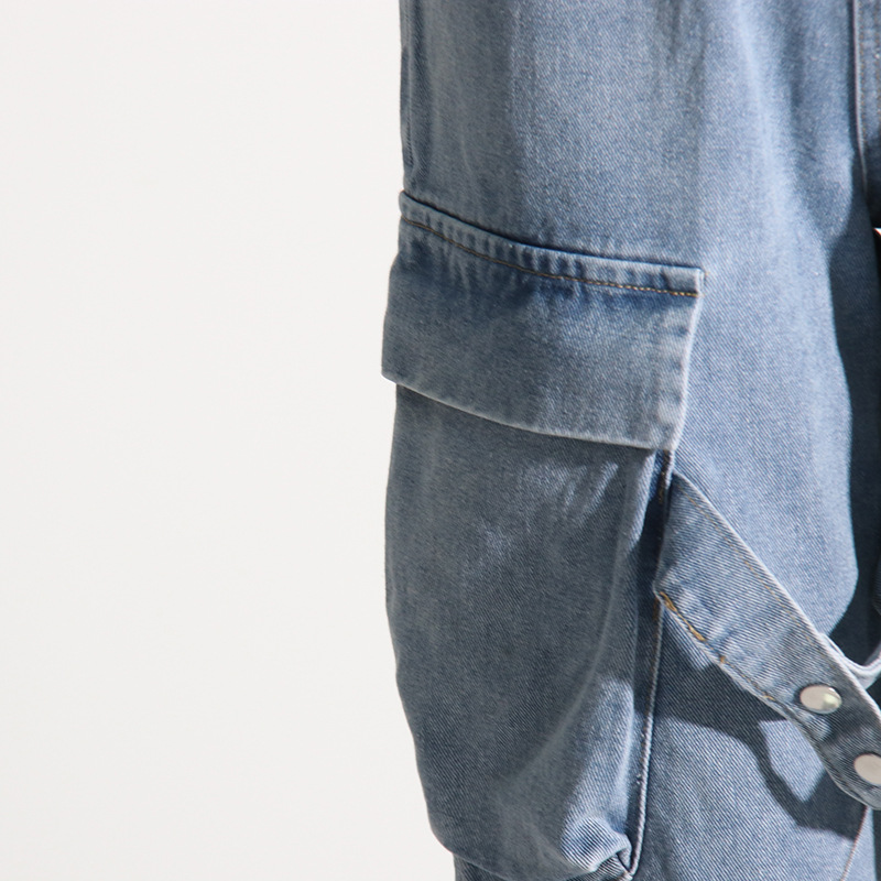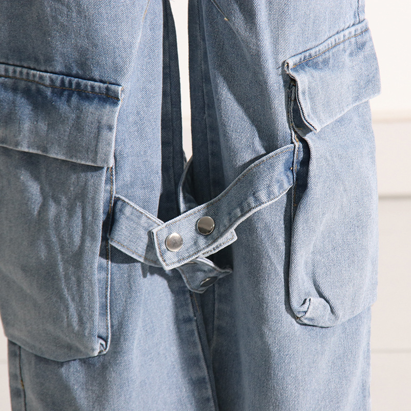 Autumn Retro Multi Pocket Design Lace Up Jeans Women Straight Casual Trousers