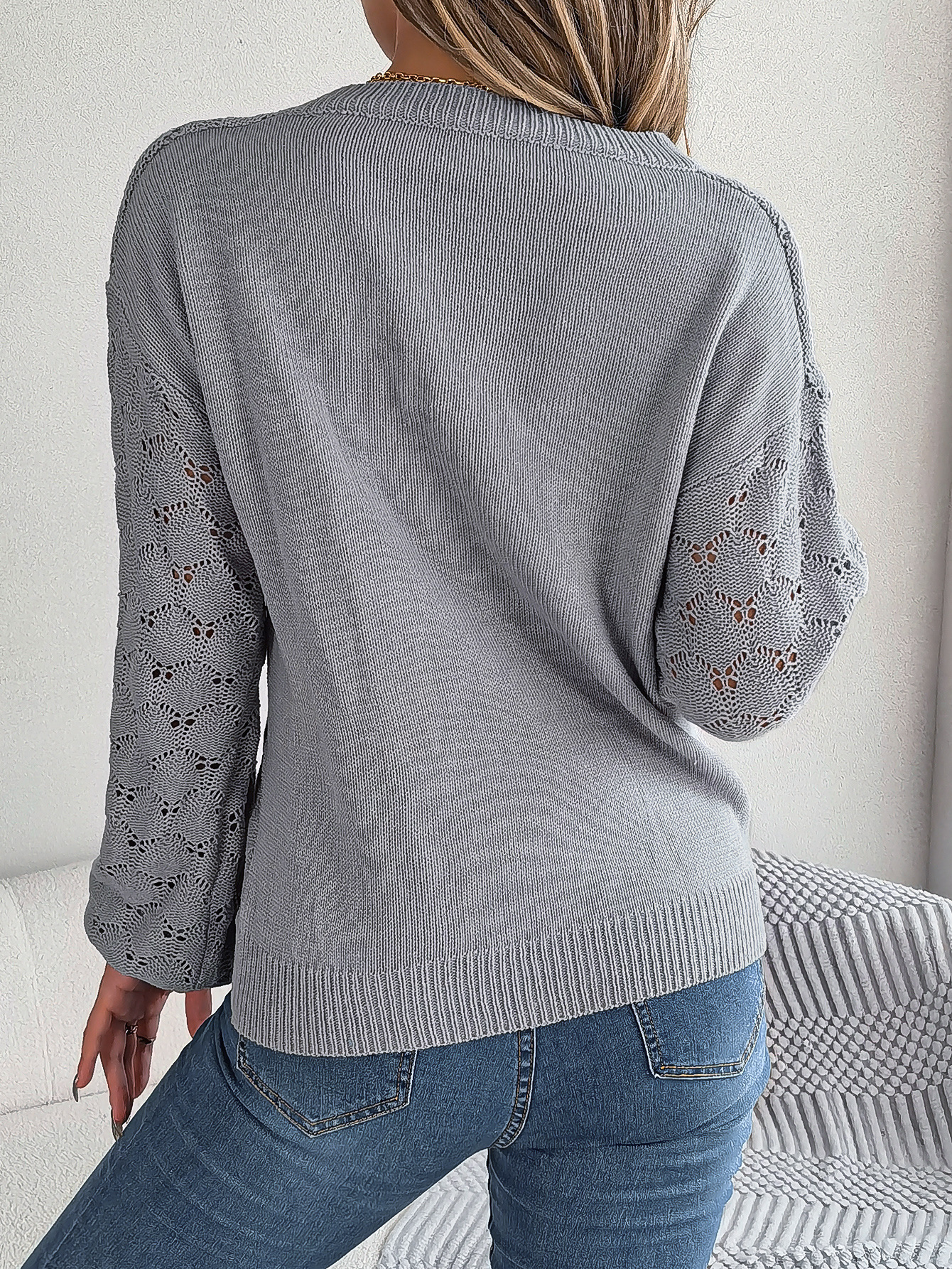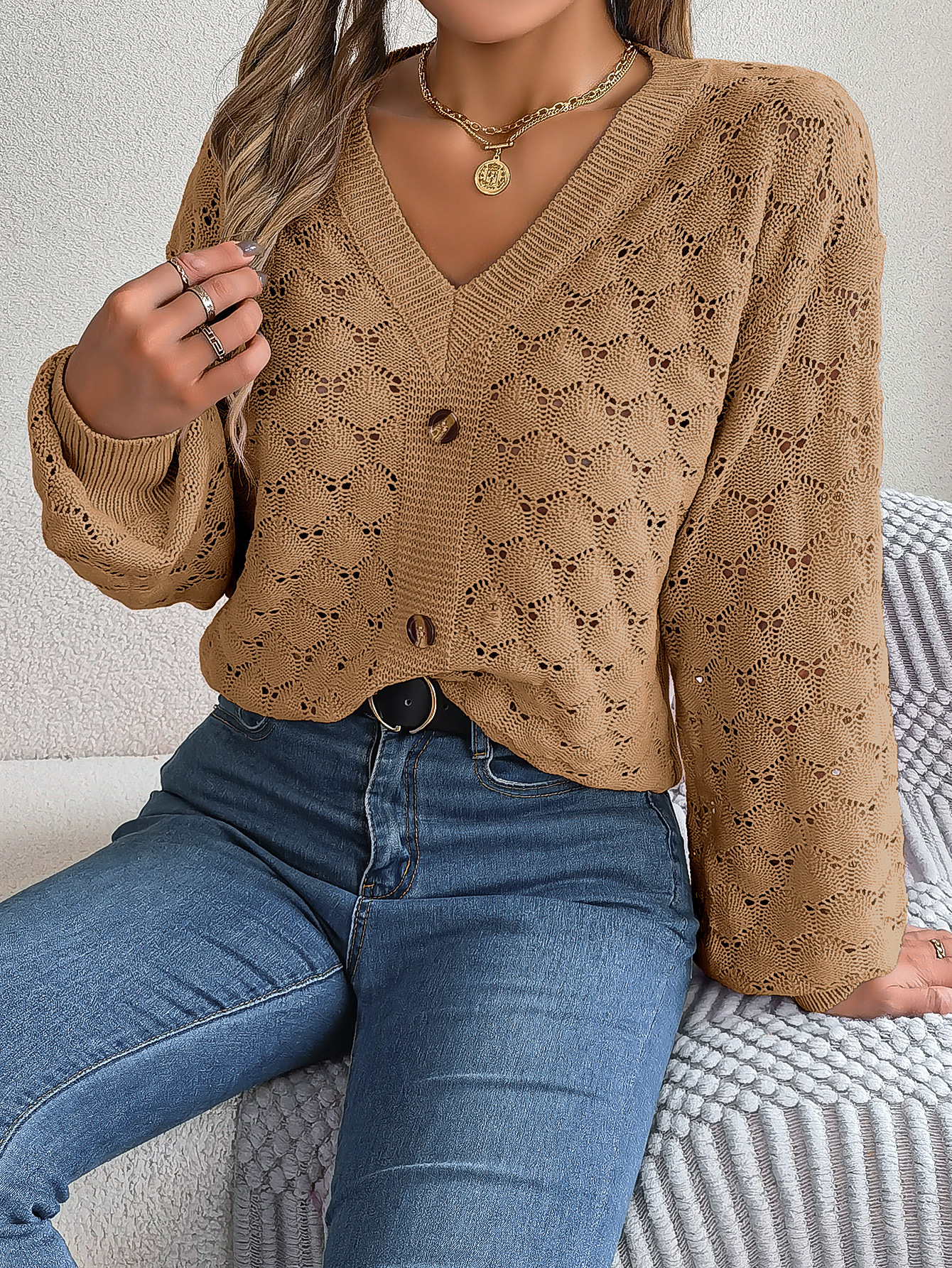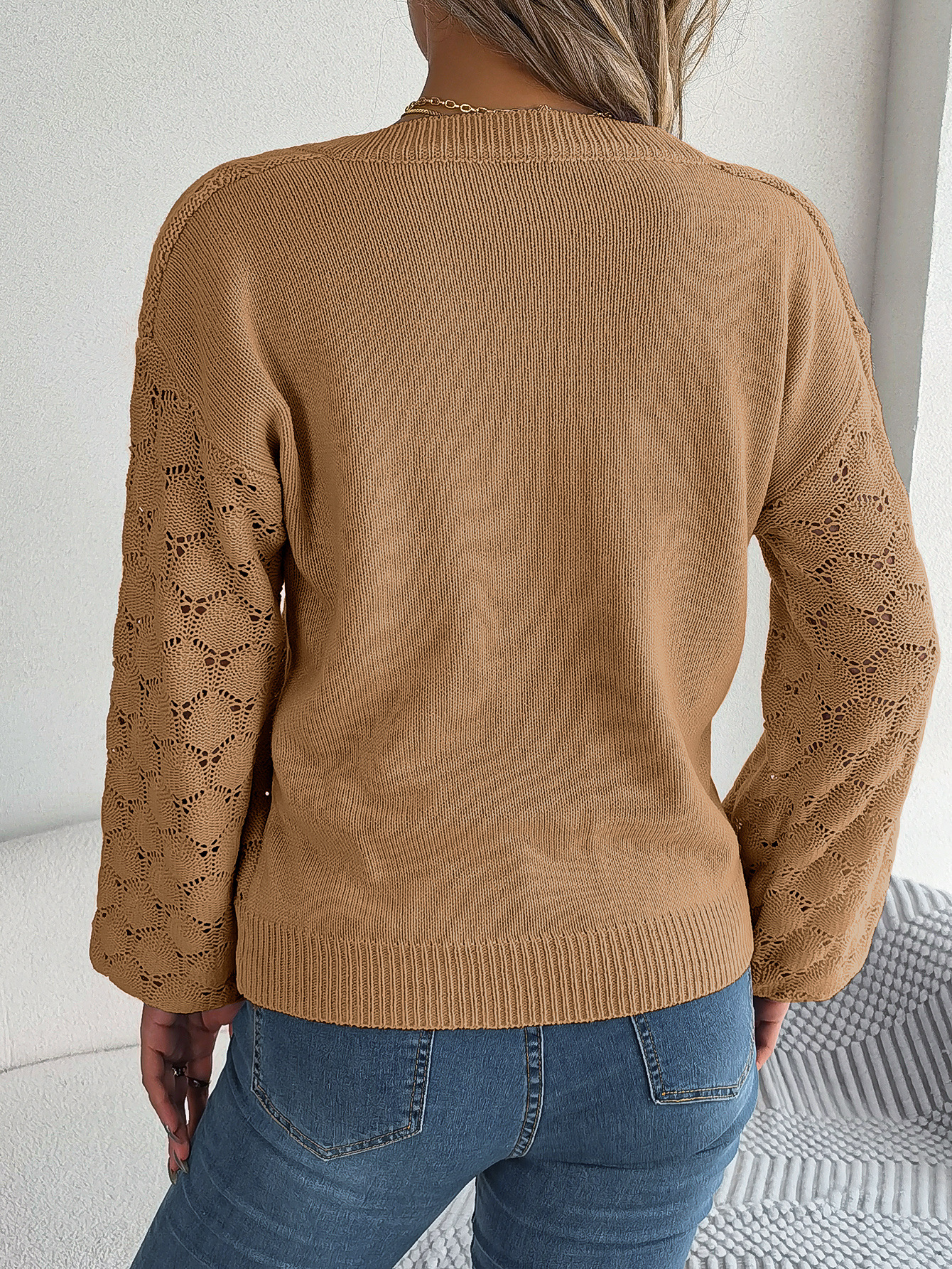 Autumn Winter Casual V neck Buttons Hollow Out Cutout out Lantern Sleeve Pullover Sweater Women Clothing