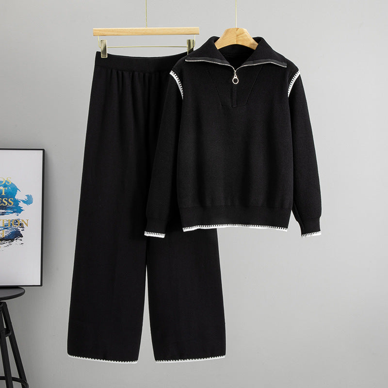 Autumn Winter Contrast Color Stand up Collar Contrast Color Long Sleeves Knitwear High Waist Wide Leg Pants Two Pieces Sets