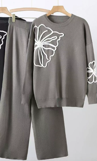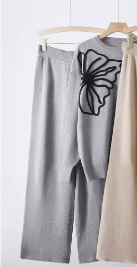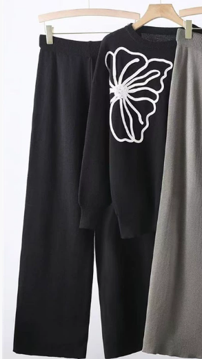 Autumn Winter Crew Neck Pullover Sweater Women Floral Line All Match Top Two Piece Sets
