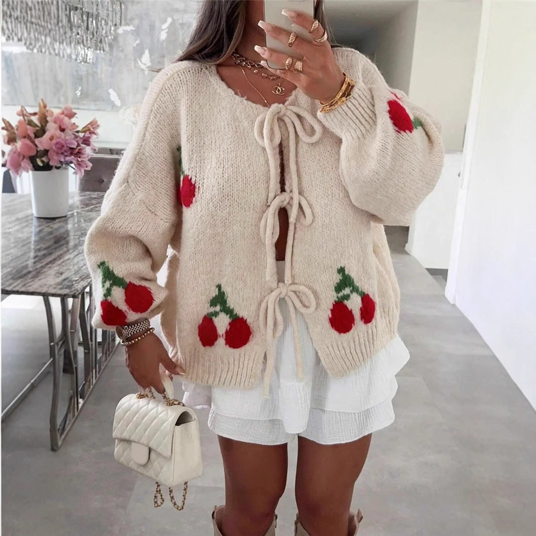 Autumn Winter Knitting Cardigan Loose Casual Sweater Strawberry Cherry Tie Front Top