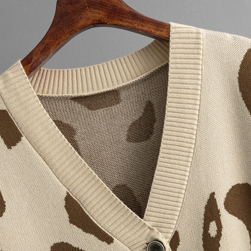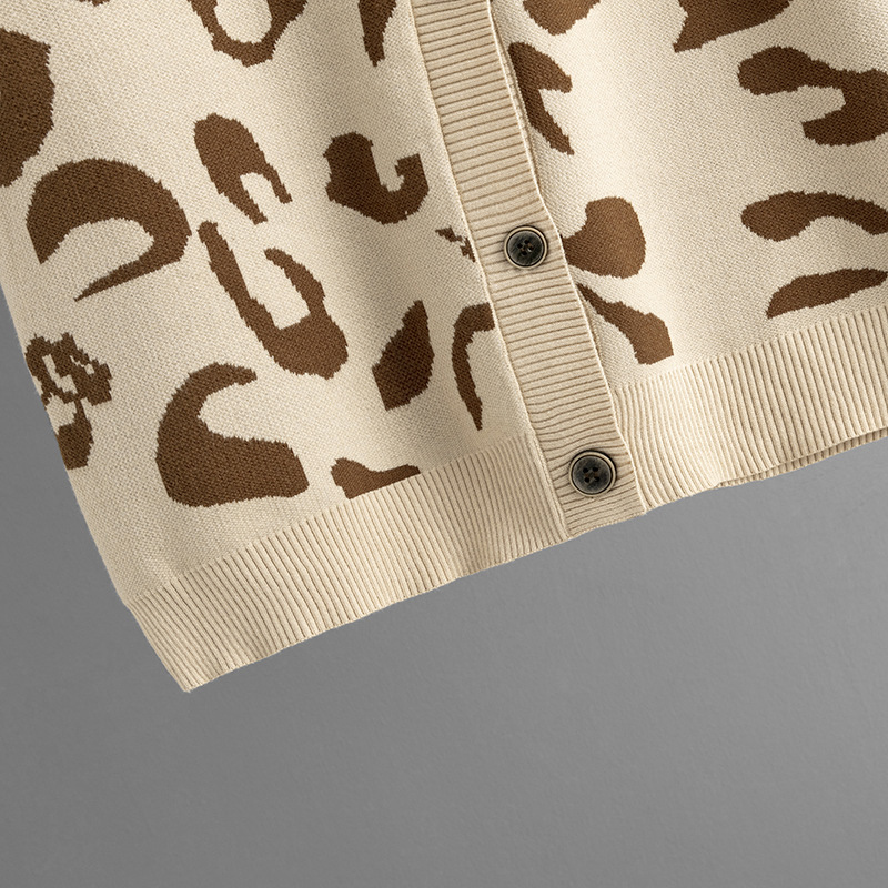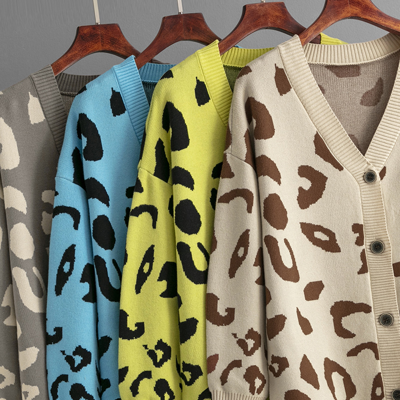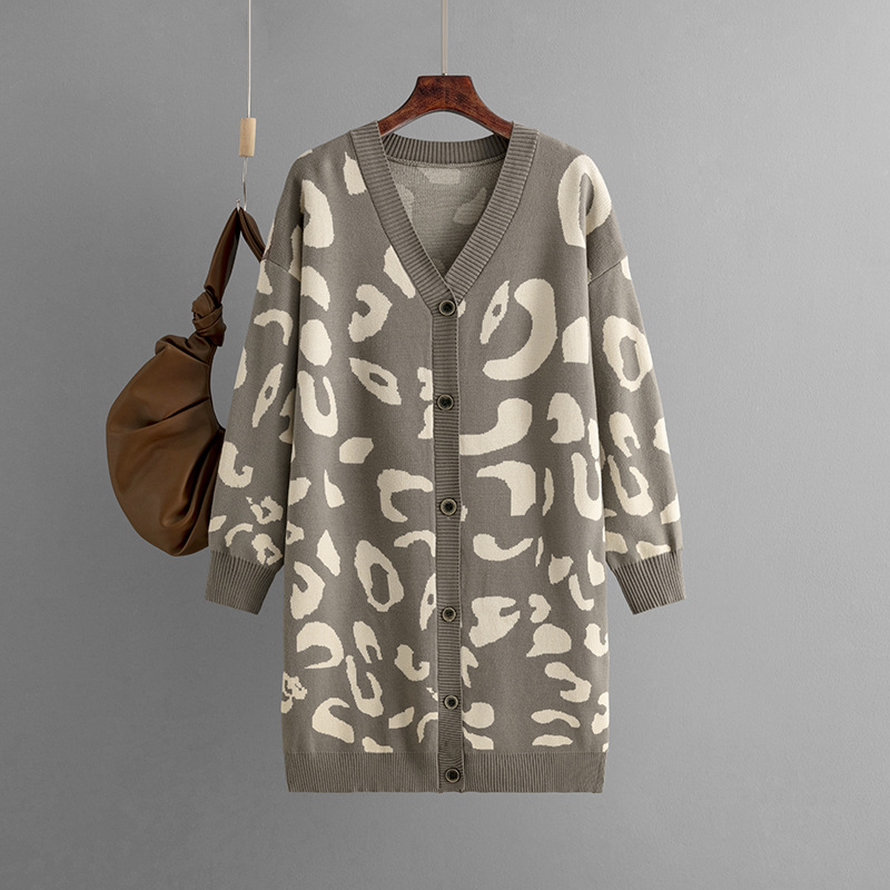 Autumn Winter Knitwear Mid Length Leopard Print Sweater Cardigan Women Baggy Coat