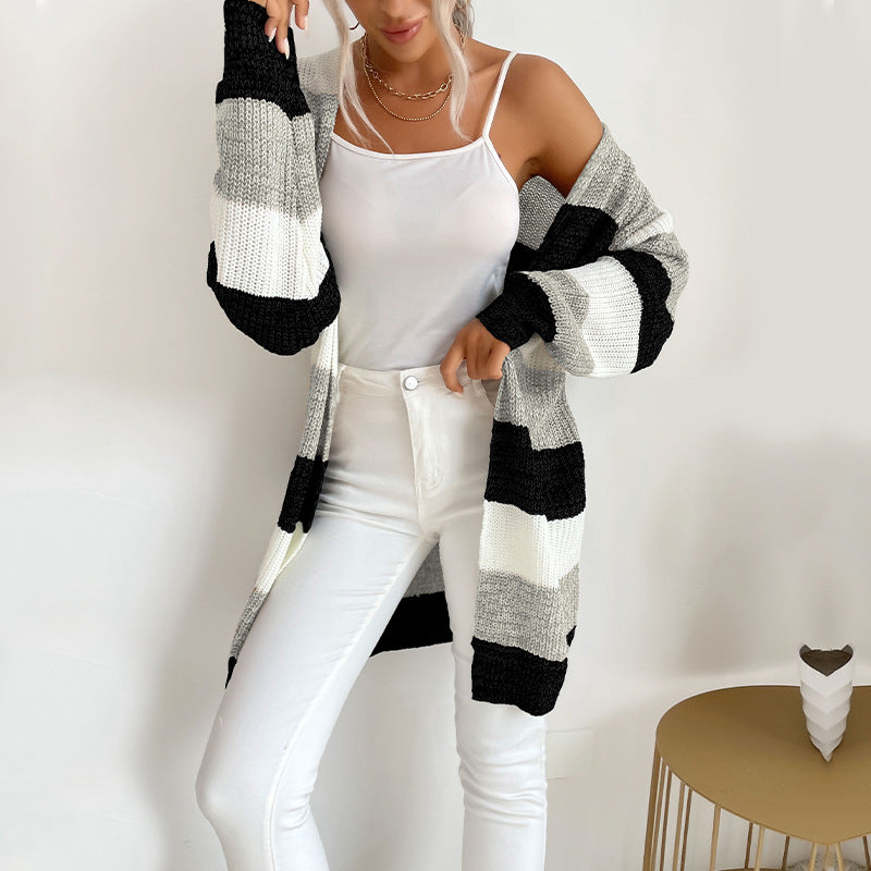 Autumn Winter Middle East Women Long Button Free Colorblock Sweater Coat