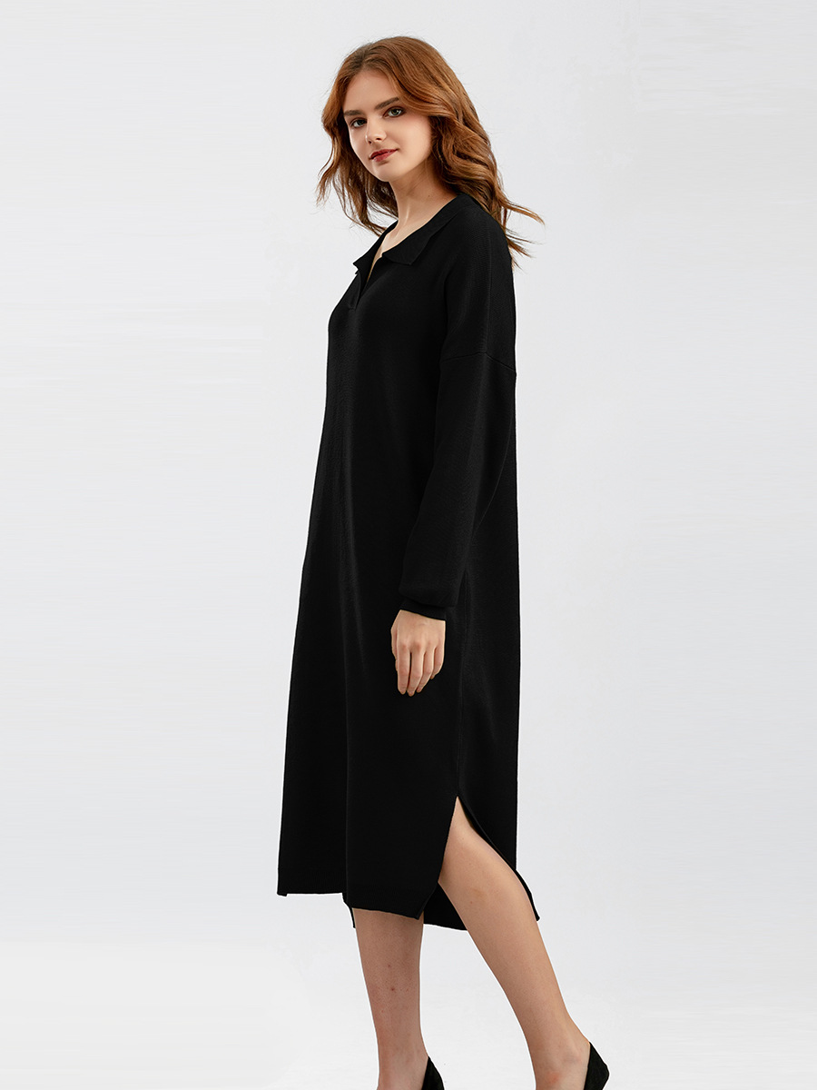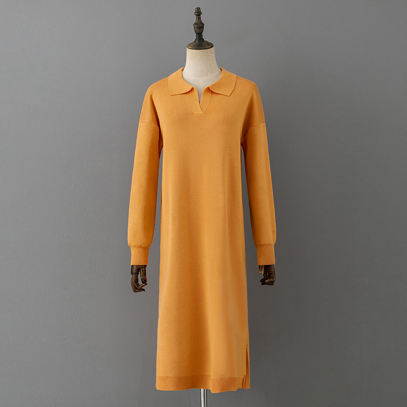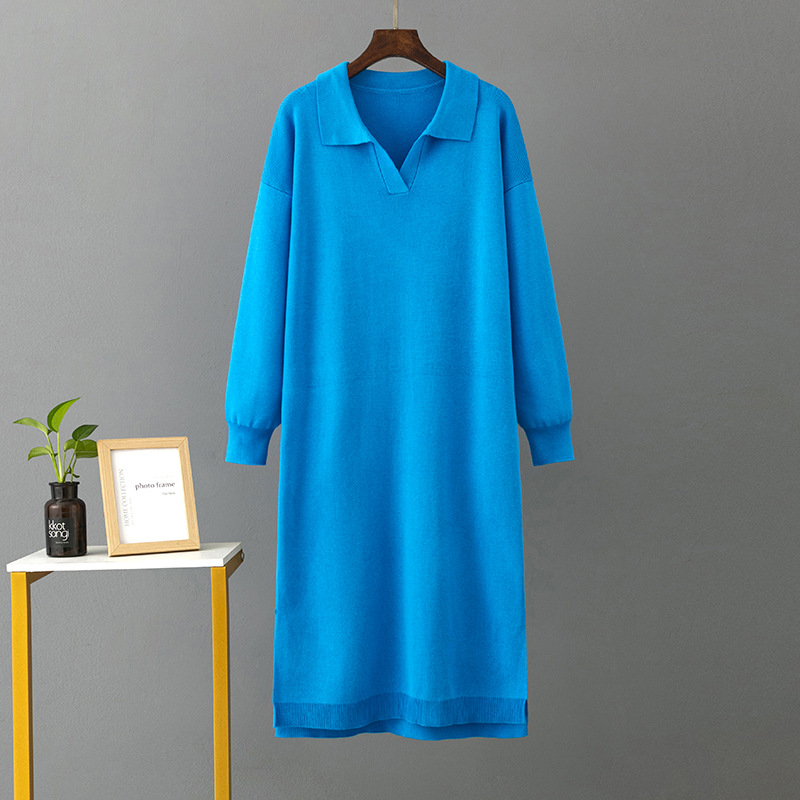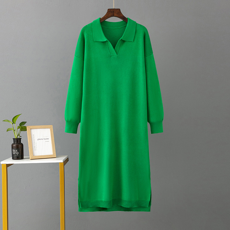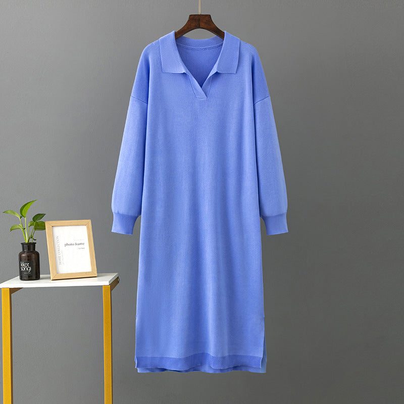 Autumn Winter Polo Collar Base Knitting Loose Solid Color Women Dress
