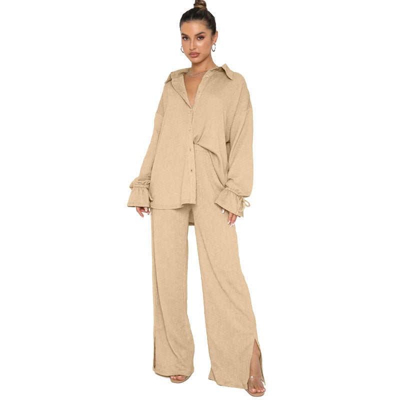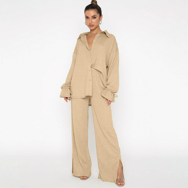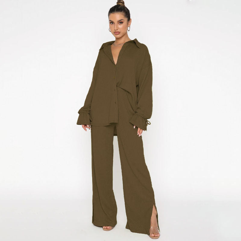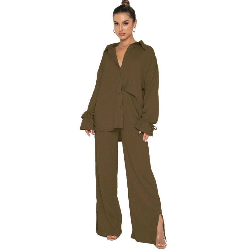 Autumn Winter Solid Color Polo Collar Single Breasted Long Sleeve Tied Top Women Clothing Smart Trousers Suit