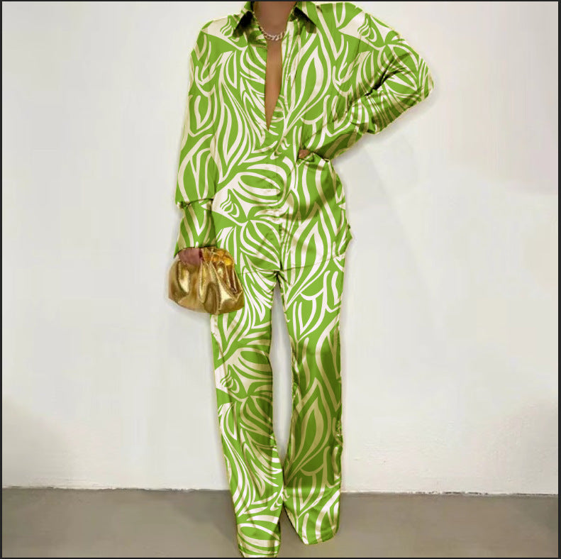 Autumn Winter Women Printed Casual Long Sleeve Shirt Loose Trousers Two Piece Suit