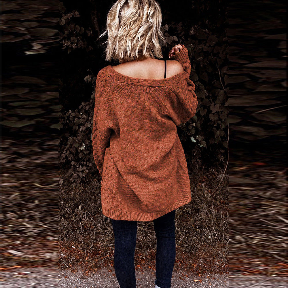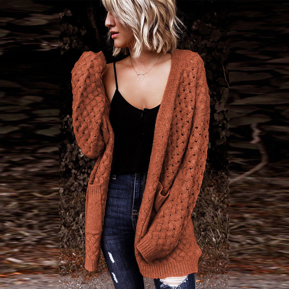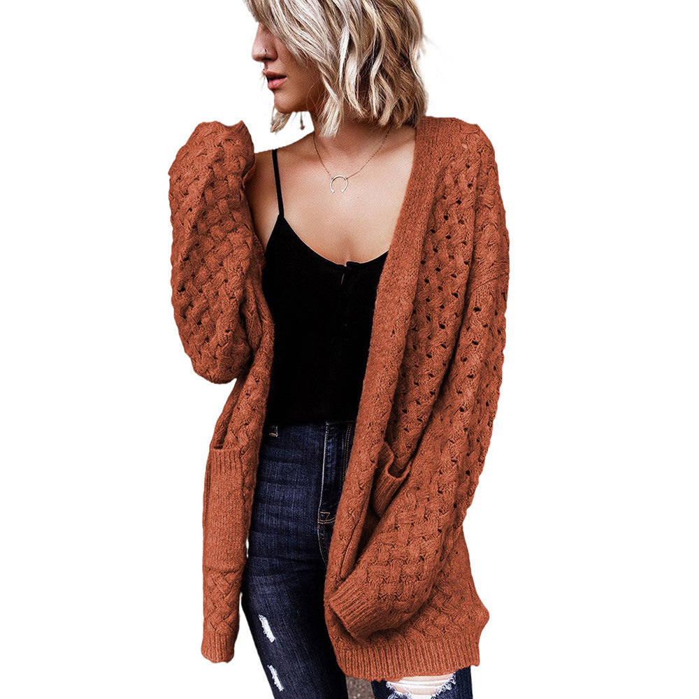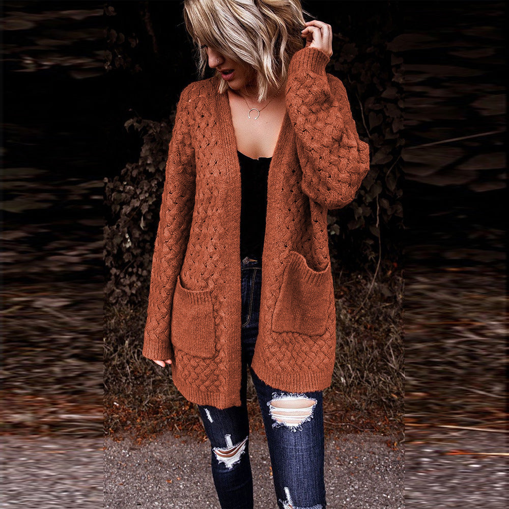 Brown Pocket Cardigan Sweater Women Arrival Mid Length Cardigan Coat