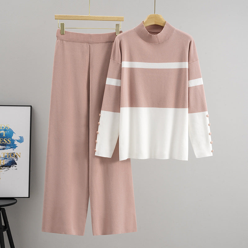 Casual Knitting Two Piece Sets Women Autumn Winter Loose Long-Sleeved Contrast Color Top Contrast Color Top High Waist Slimming Wide
