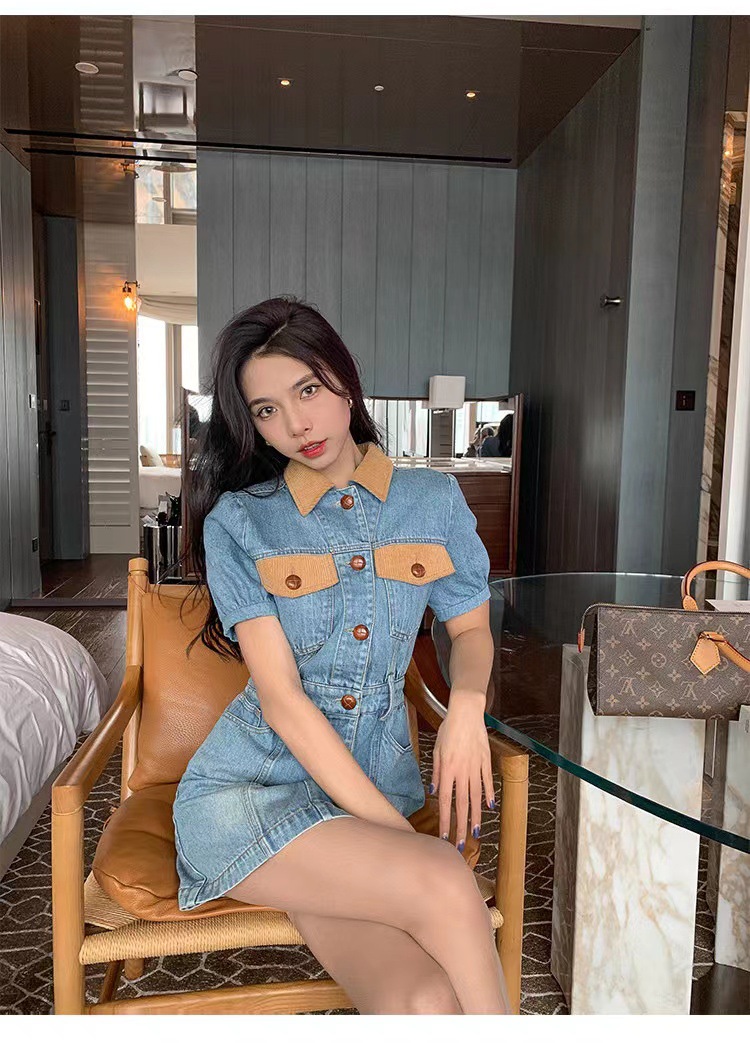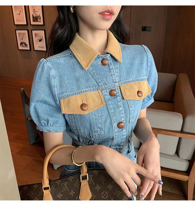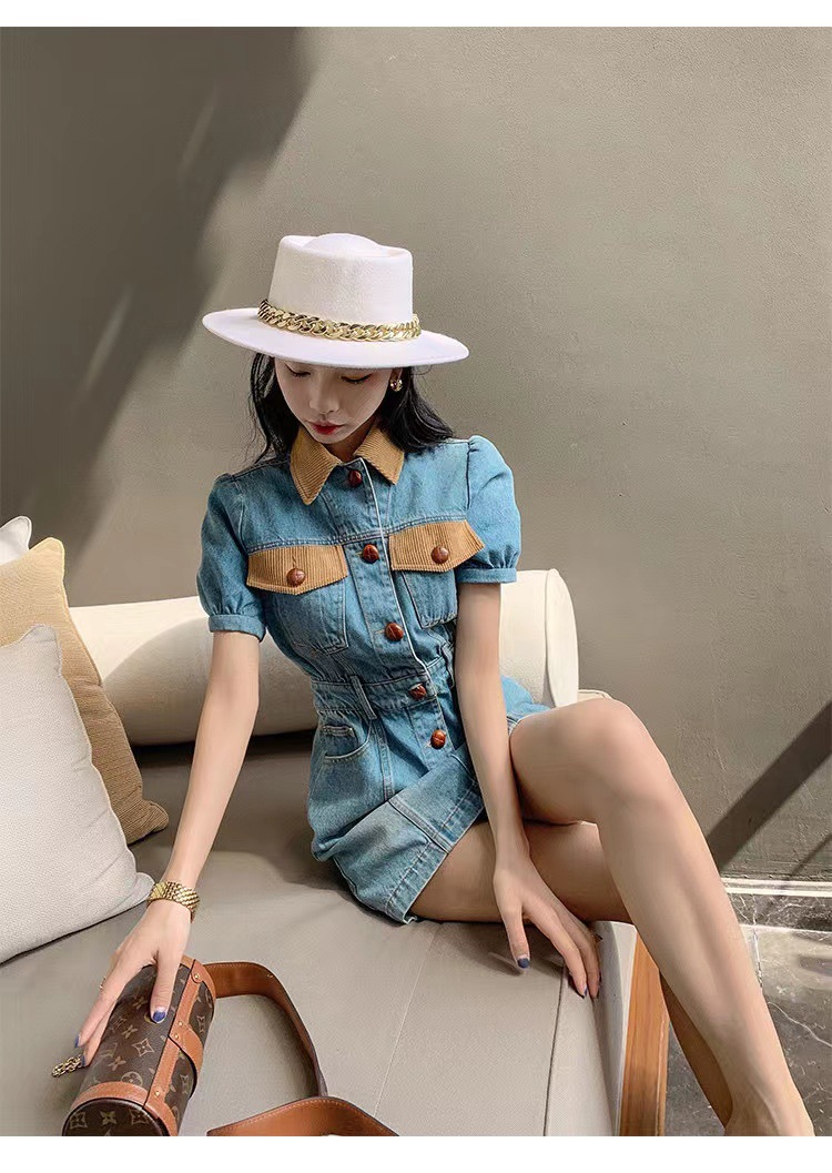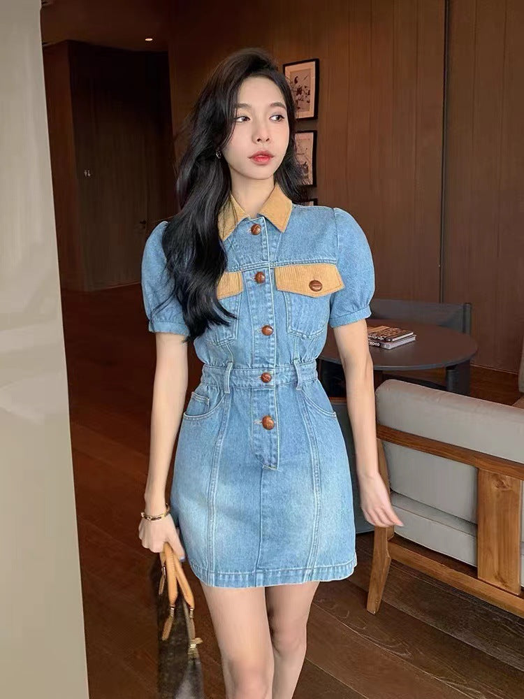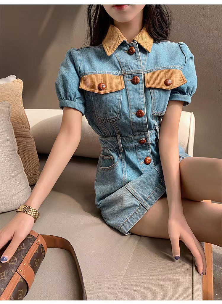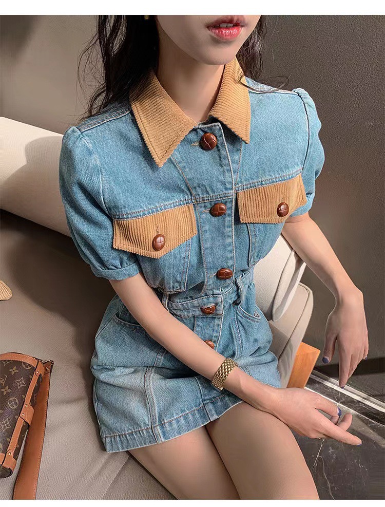 Contrast Color Stitching Waist Denim Dress Spring Summer Elegant Slimming Short Sleeve High Waist A Line Dress