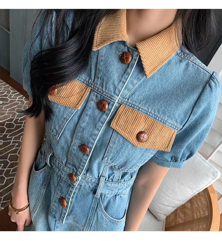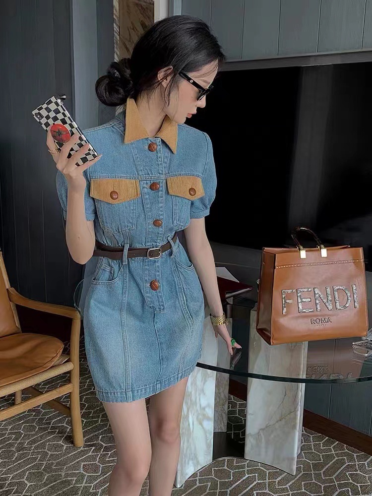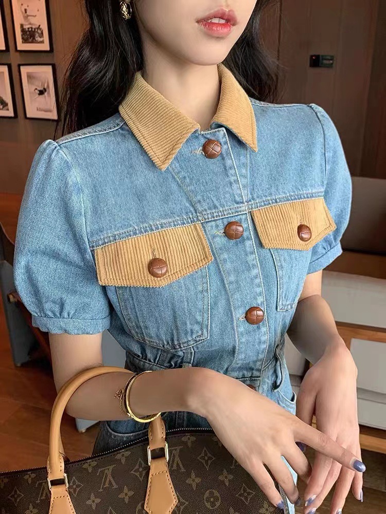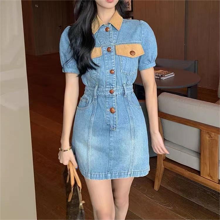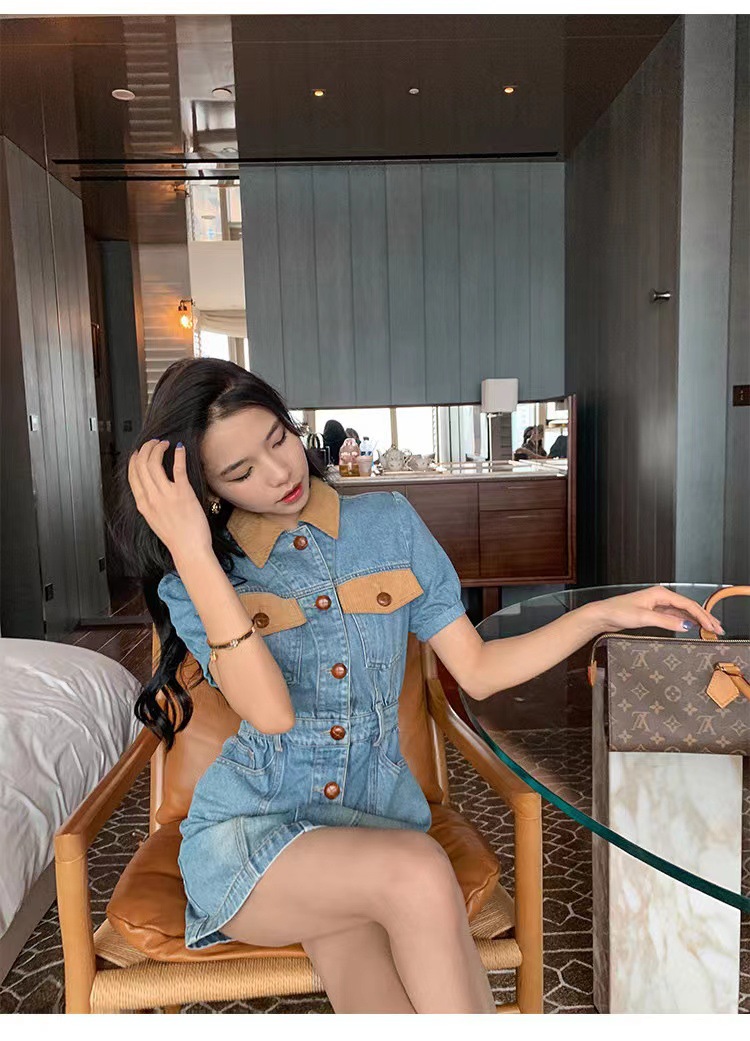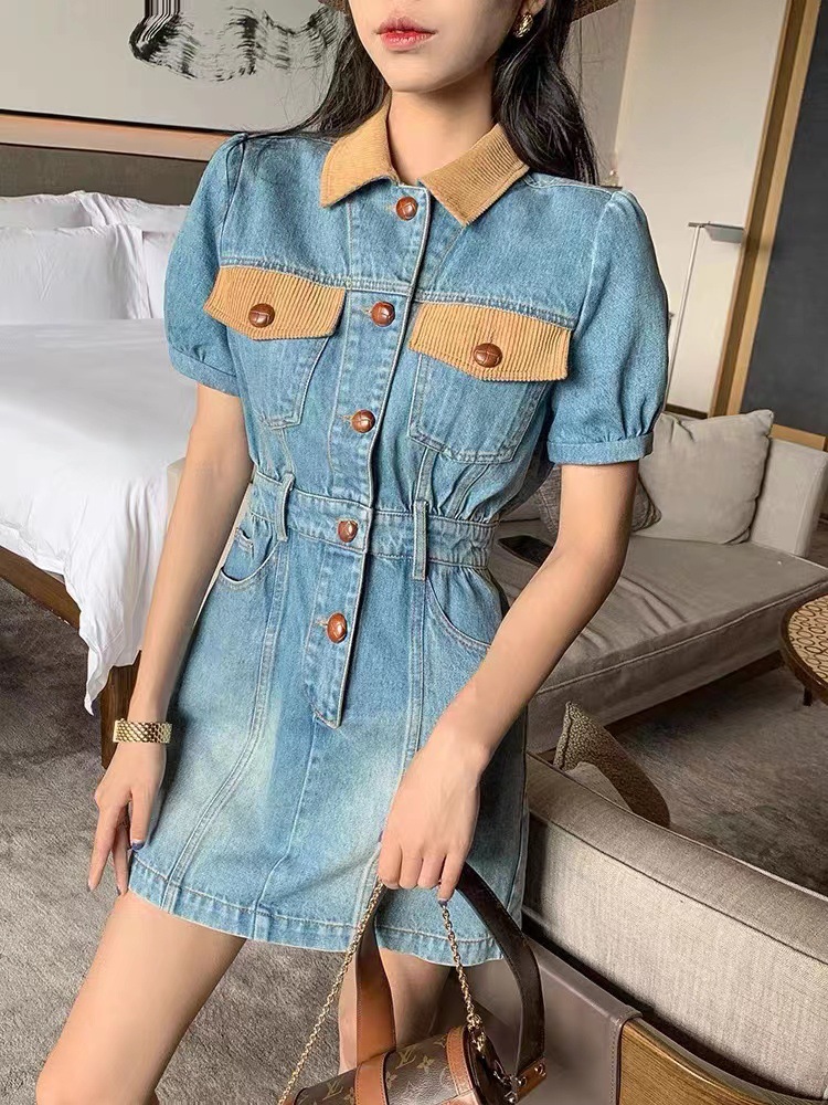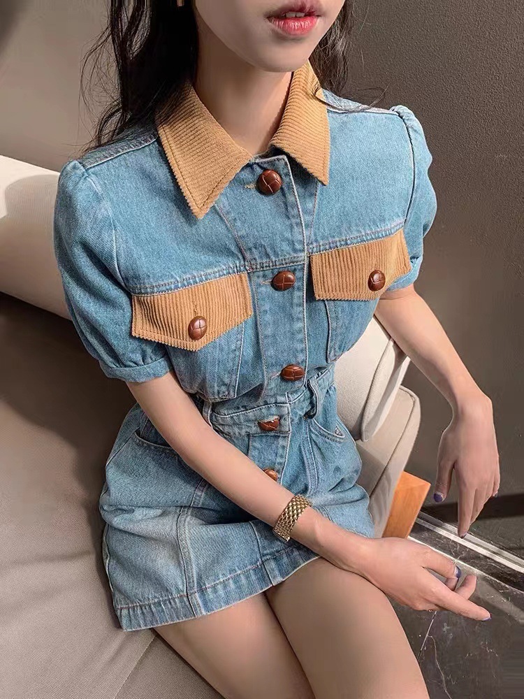 Contrast Color Stitching Waist Denim Dress Spring Summer Elegant Slimming Short Sleeve High Waist A Line Dress