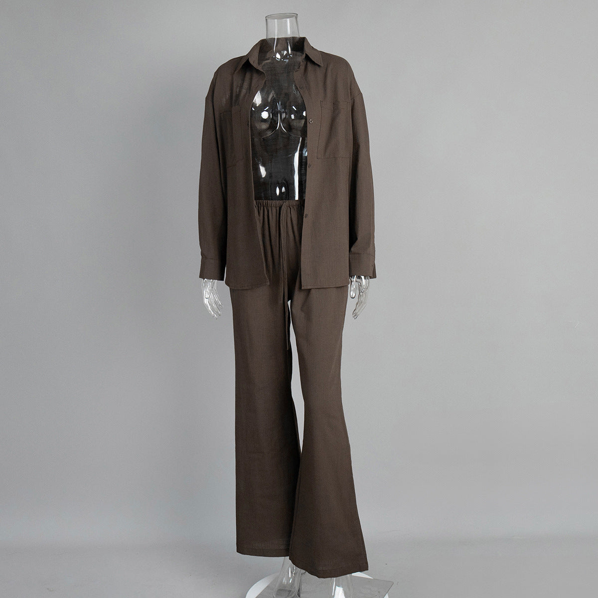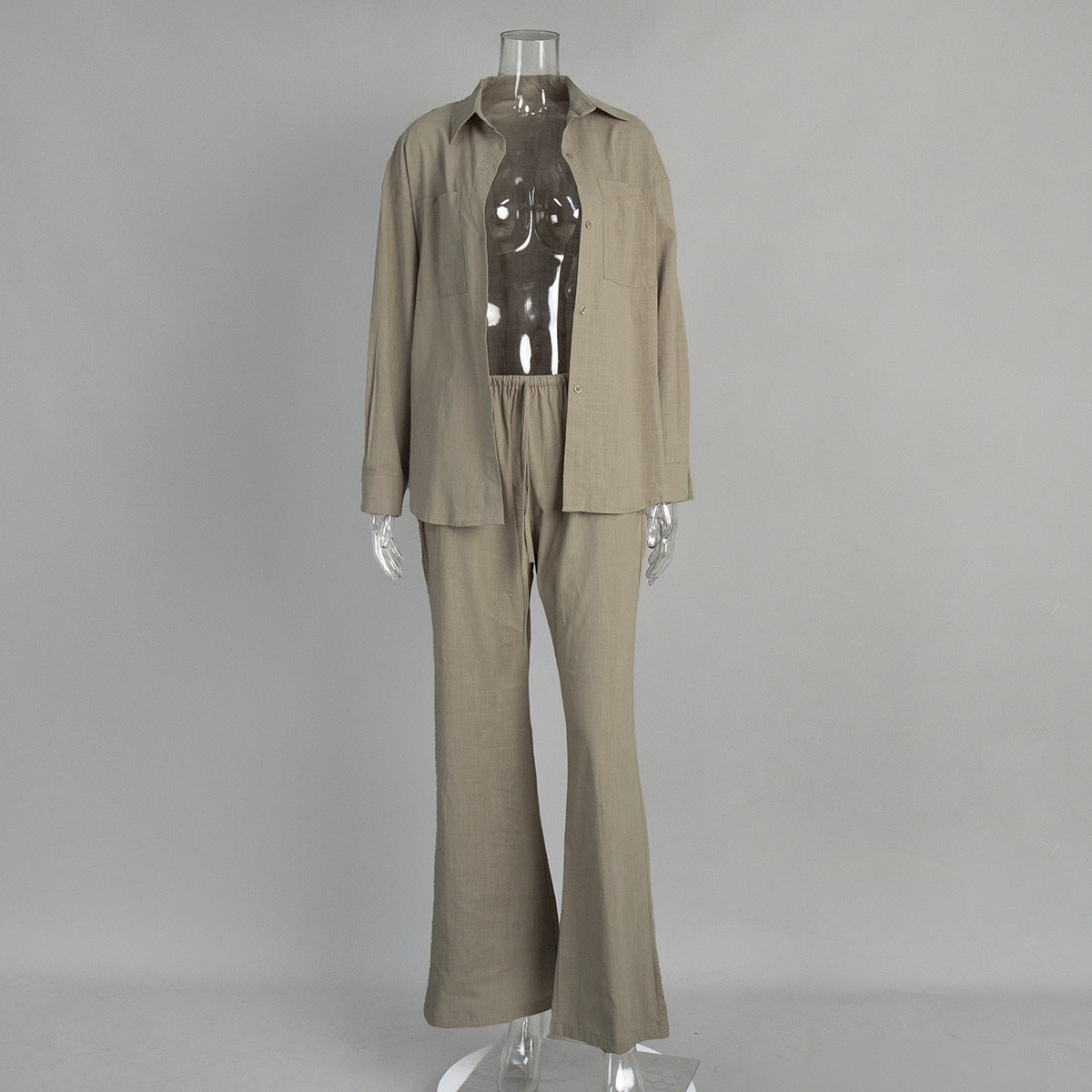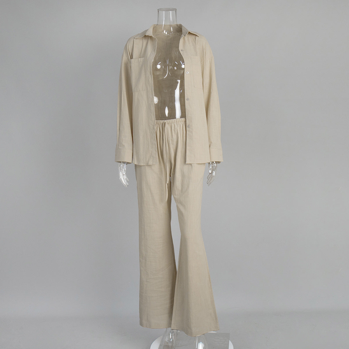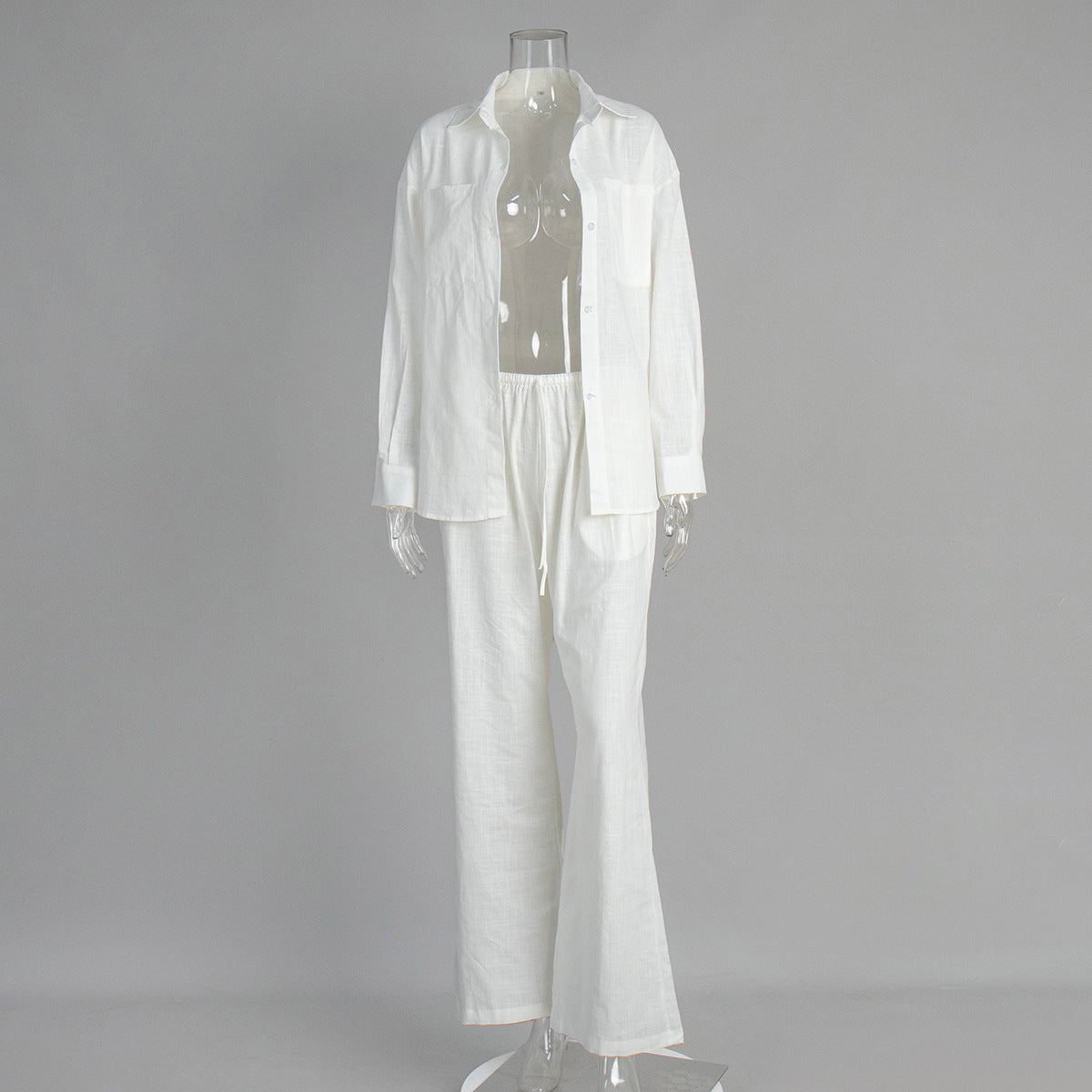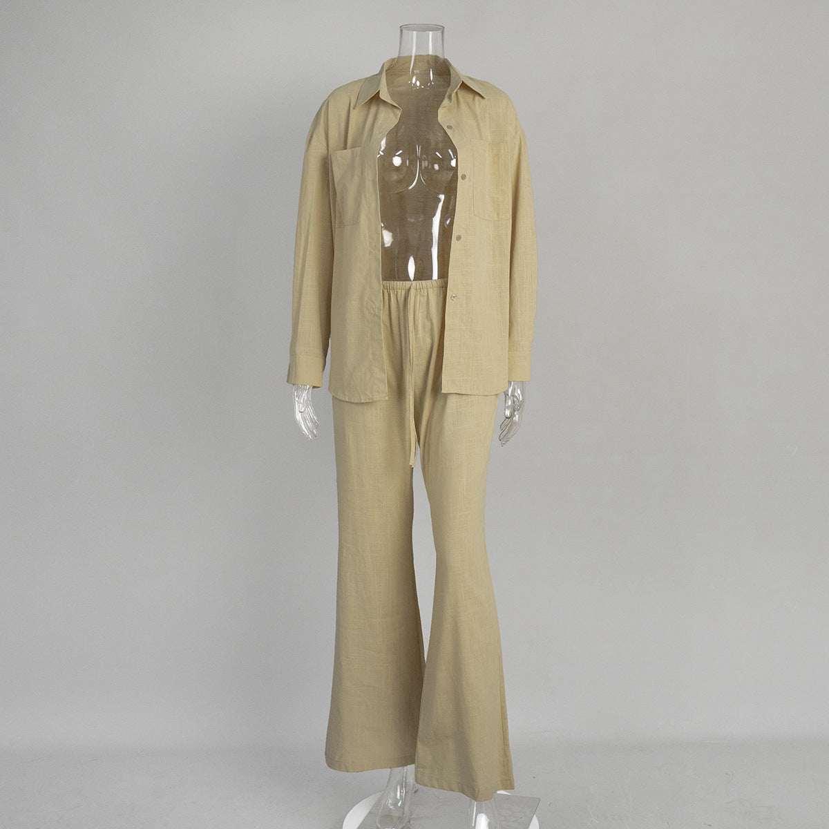 Cotton Long Sleeved Shirt Wide Leg Trousers Summer Solid Color Bootcut Pants Casual Two Piece Sets