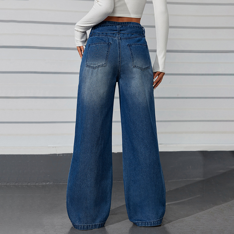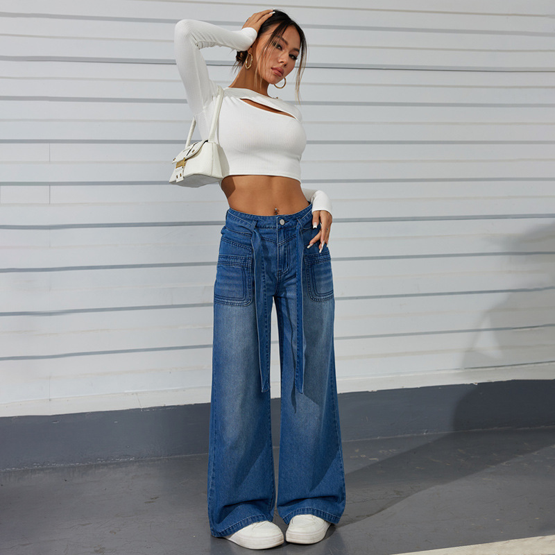 Dark Blue Wide Leg Jeans Women Street Casual Lace up High Waist Mopping Pants