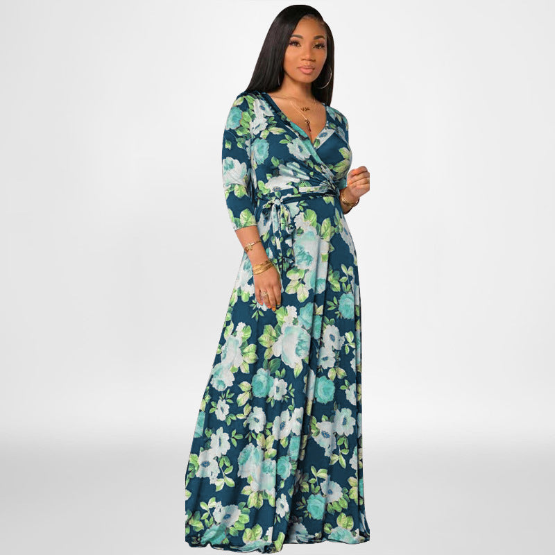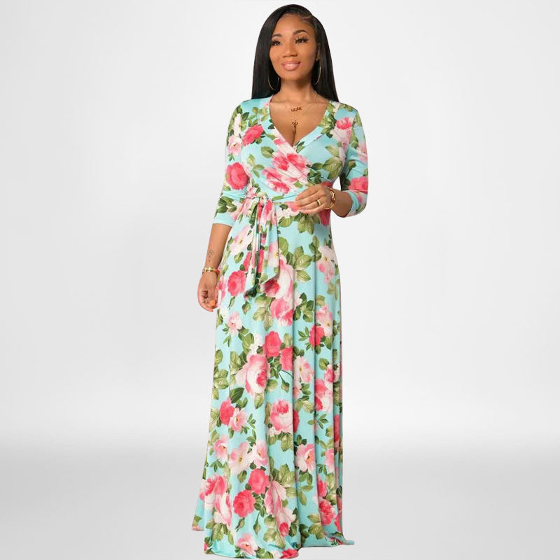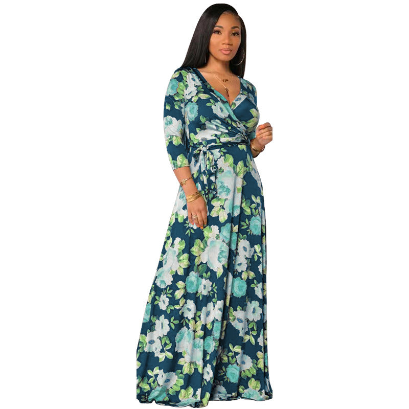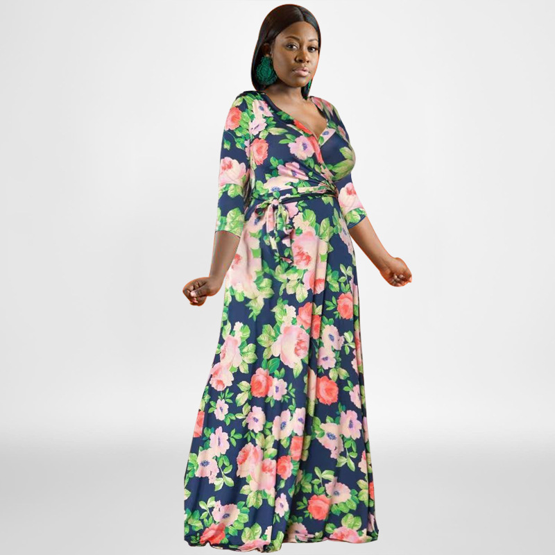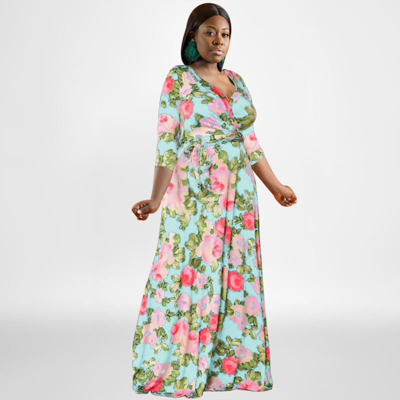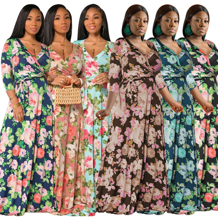 Dress Floral Print with Belt High Waist plus Size Women Dress