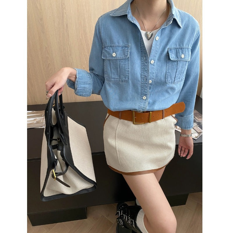 Early Autumn Relaxed Old Money Flip Pocket Design Bandage Dress Casual Denim Shirt