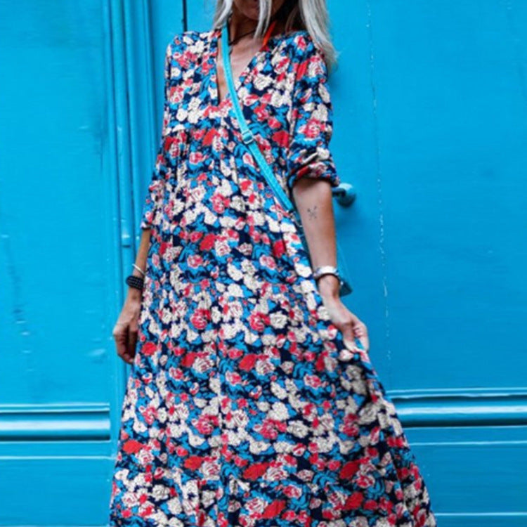 Early printed chiffon high waist commuter V-neck dress