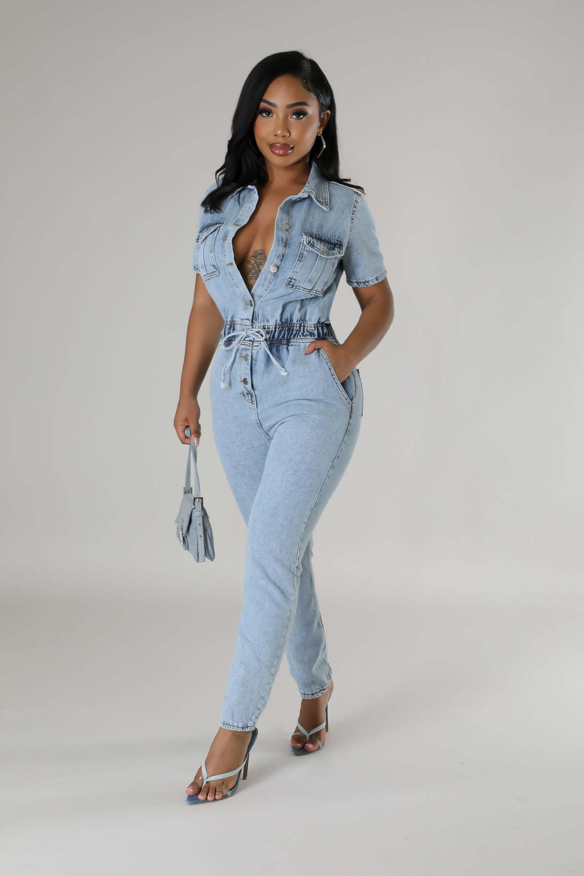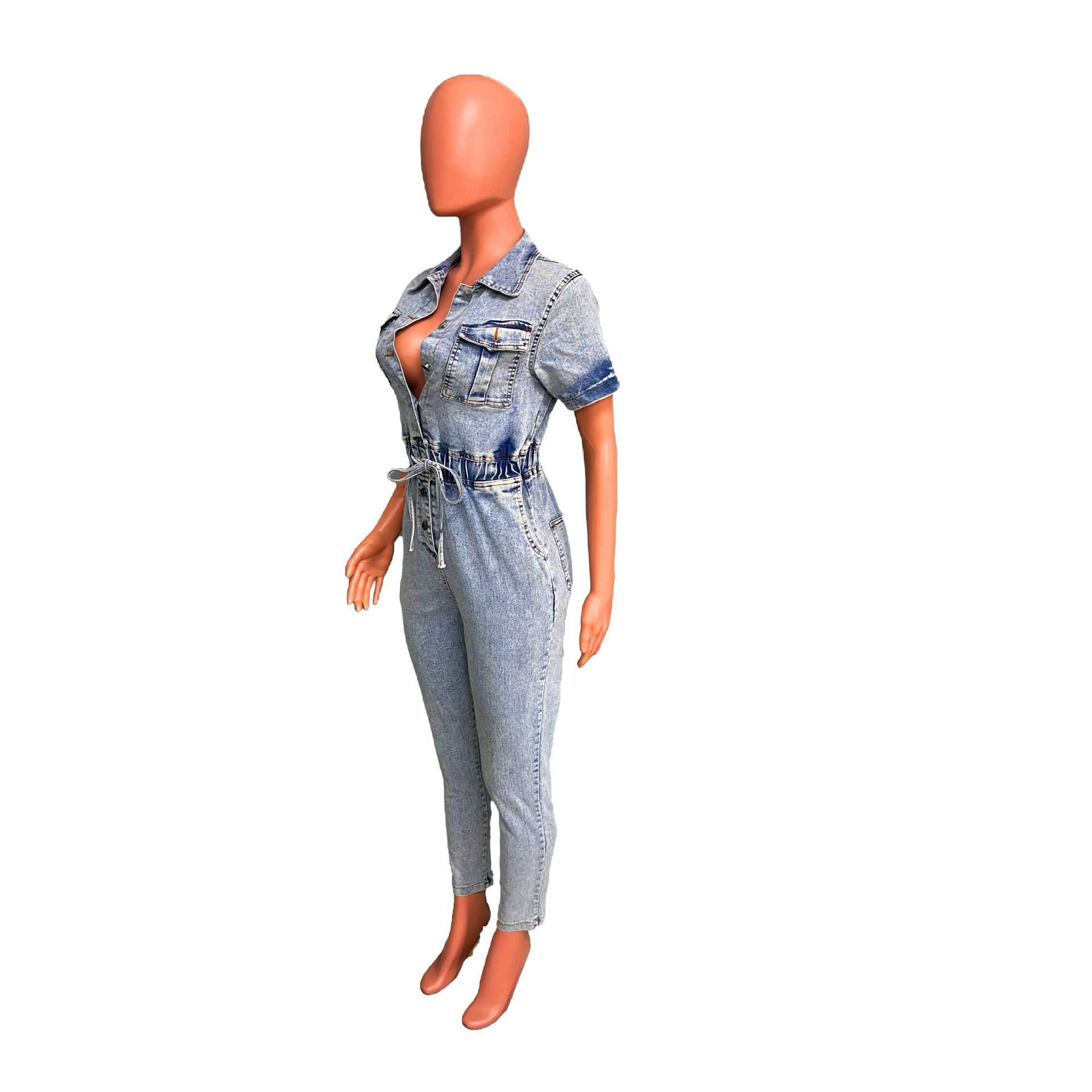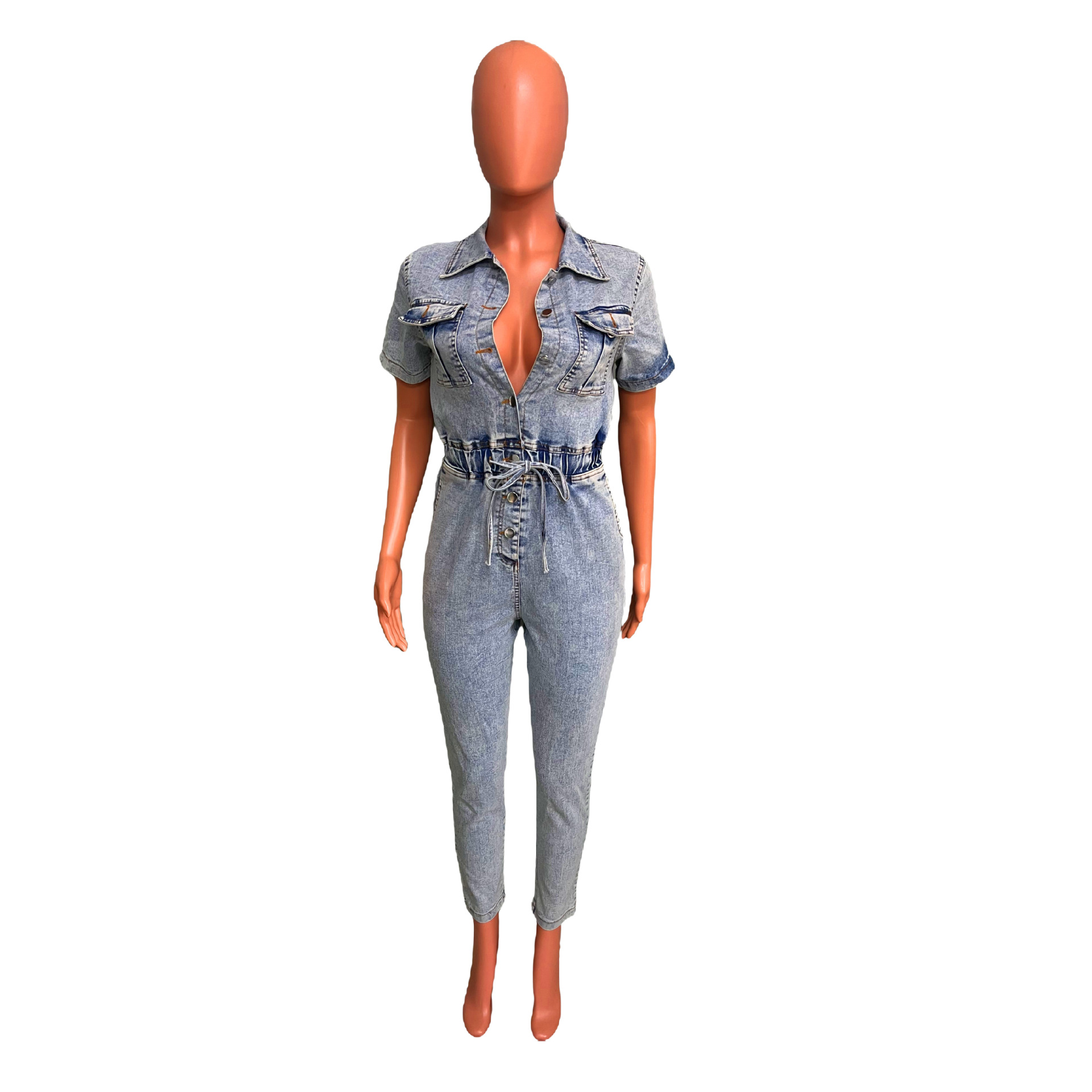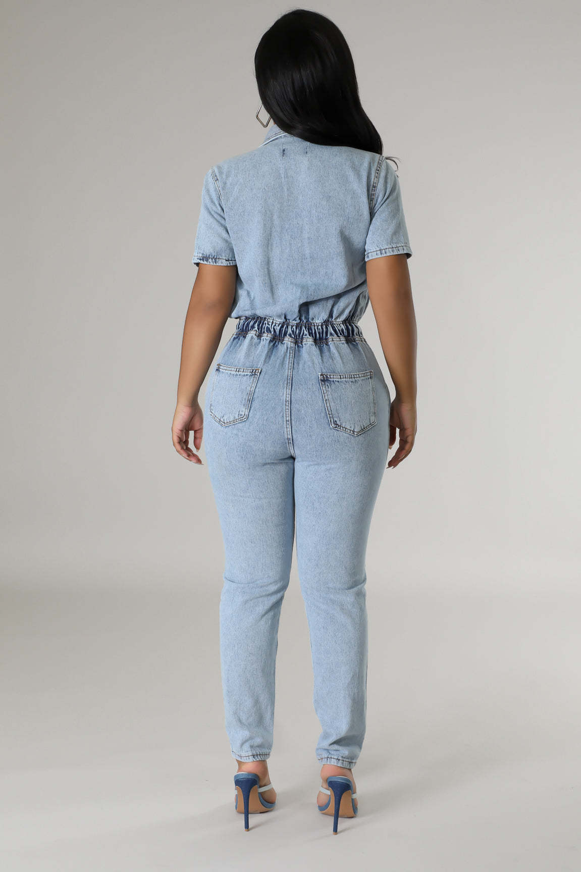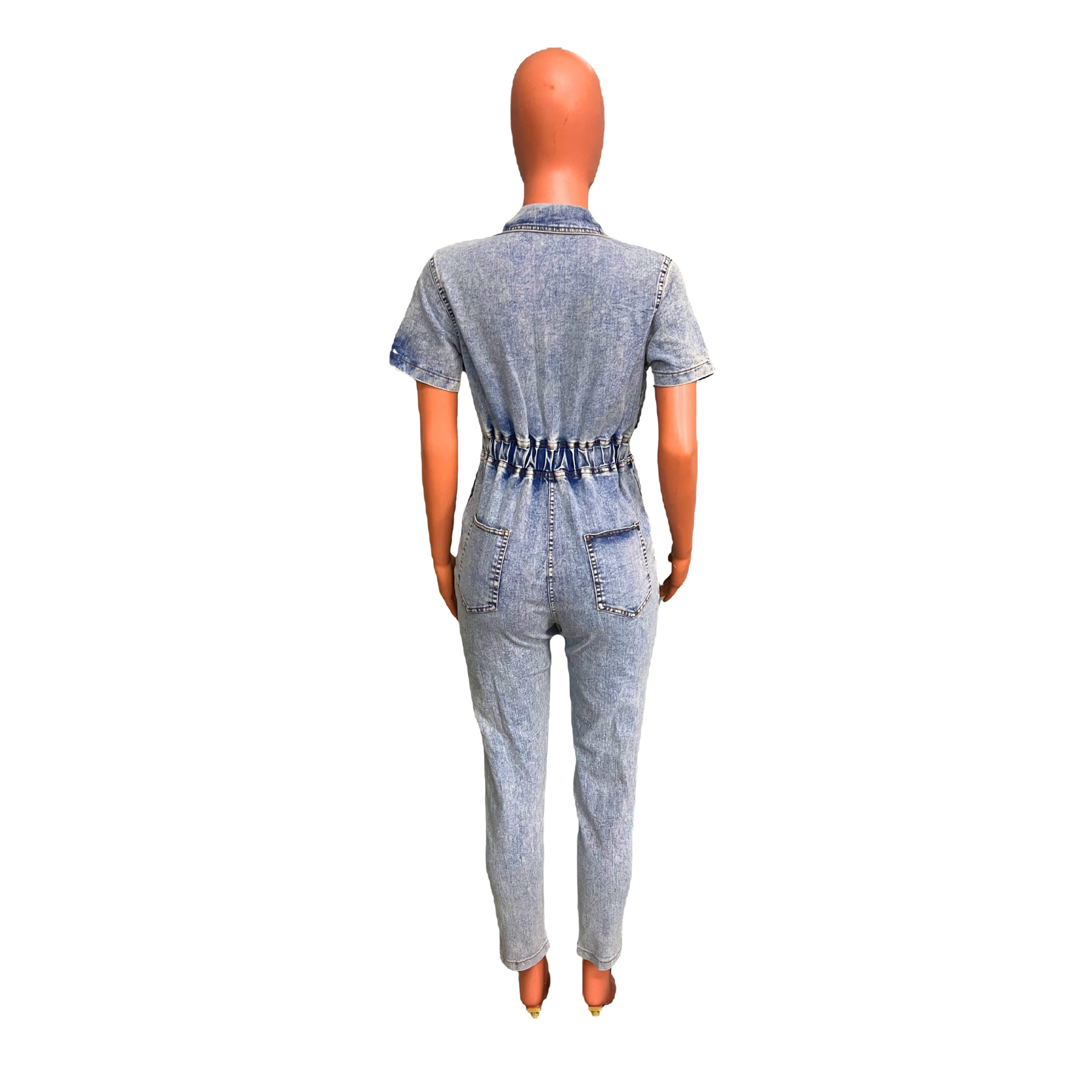 Elastic Waist Slim Elastic Feet Fried Floral Wash Denim Jumpsuit Jumpsuit