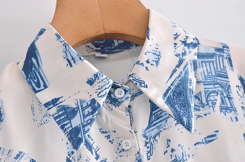 Fall Satin Architectural Printing Front Short Back Length Loose Casual Long Sleeves Shirt Top