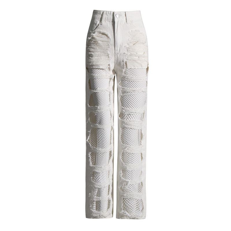 Fall Trendy Ripped Stitching Mesh Straight Leg Trousers High Waist Slimming Denim