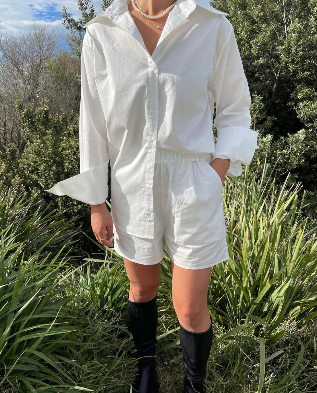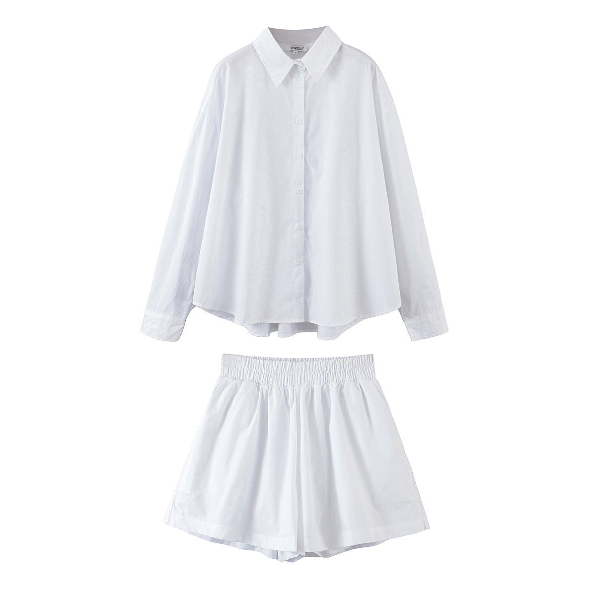 Fall Women Clothing Collared Button Long Sleeve Solid Color Elastic Waist Shorts Solid Color Suit