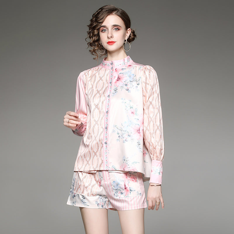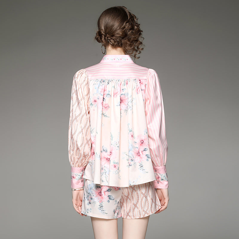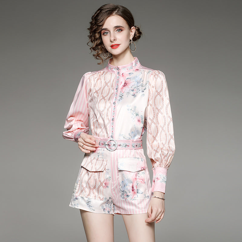 Fashion Lantern Sleeve Printed Shirt Short Pants Set With Belt