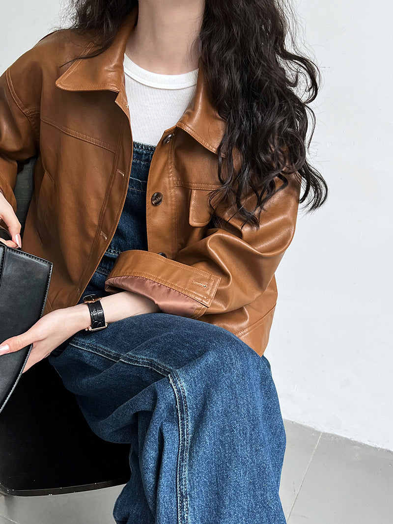Fashionable Fine Elegant Brown Profile Faux Leather Coat Women Fall Lapels Motorcycle Short Jacket Coat
