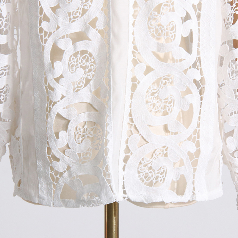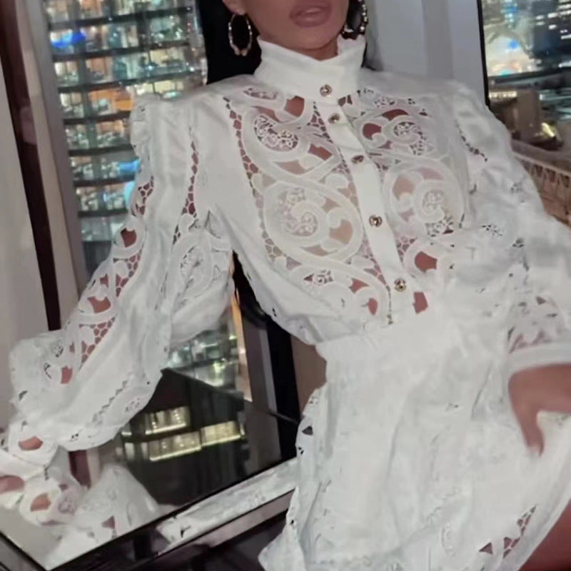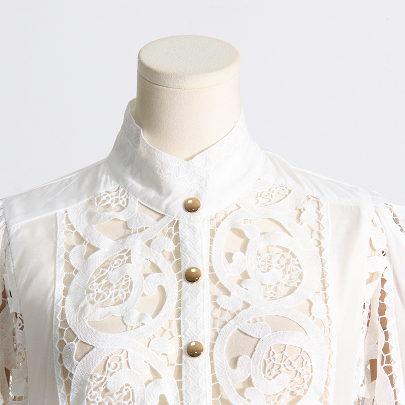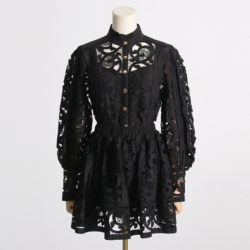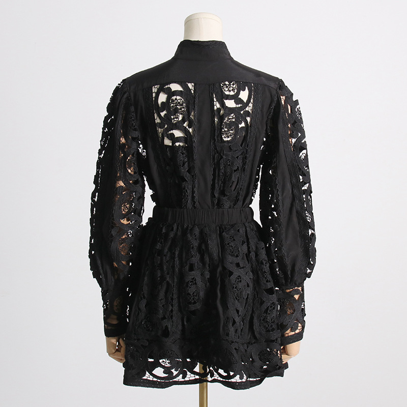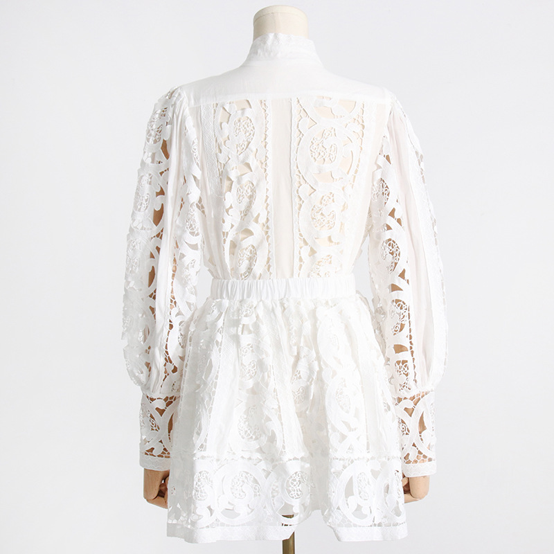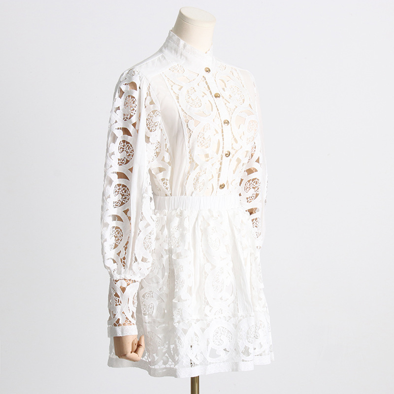 French Vintage Court Two Piece Set Stand Collar Hollow Out Cutout out Shirt High Waist Embroidered Skirt Sets
