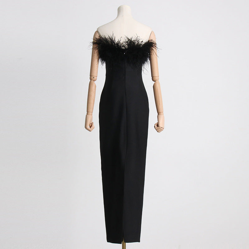 Graceful Tube Top Dress Ostrich Feather Slim Fit Patchwork Slimming Sheath Dress Women