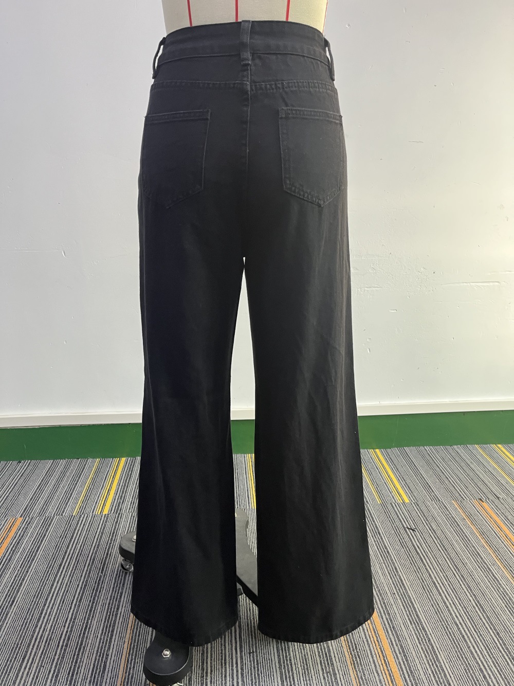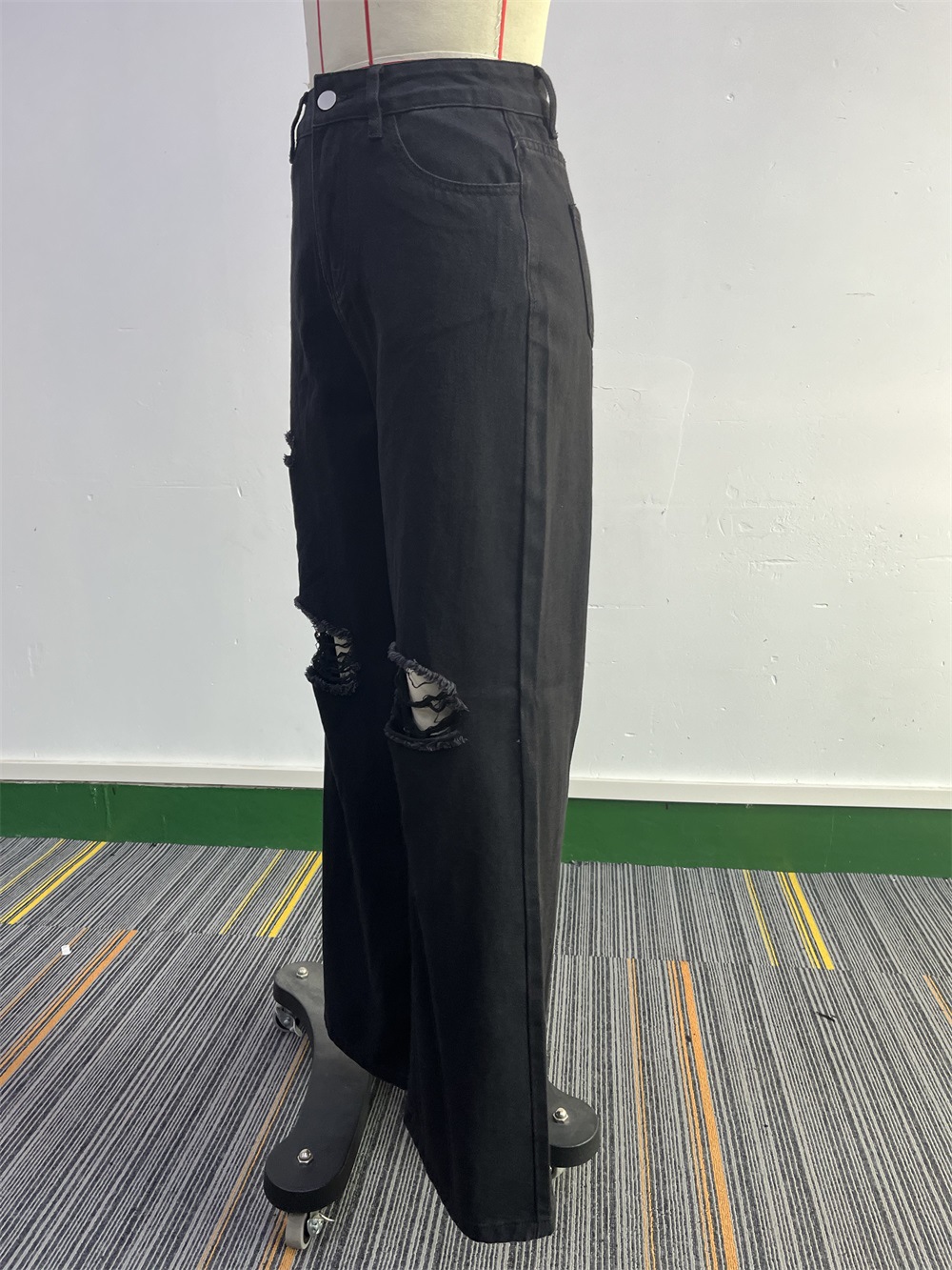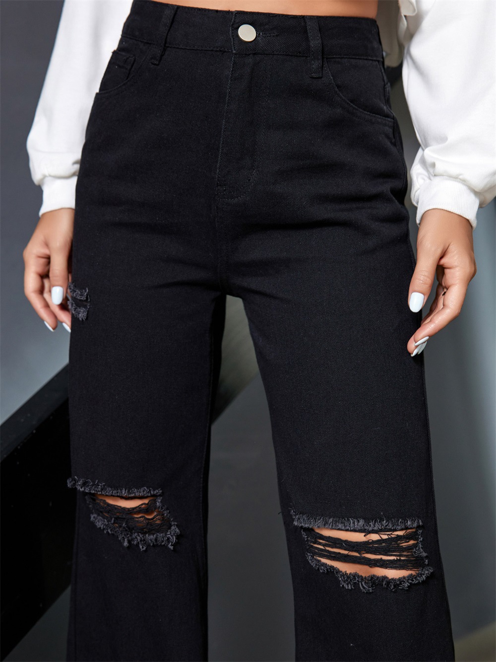 High Street Wide Leg Pants Black Ripped Loose Straight Denim Trousers for Women