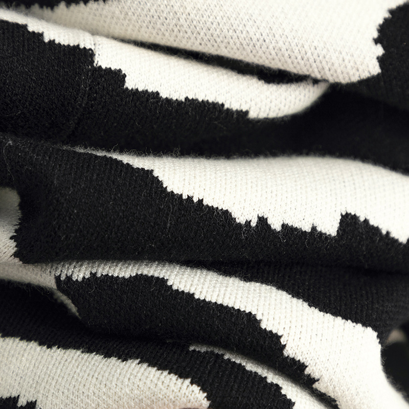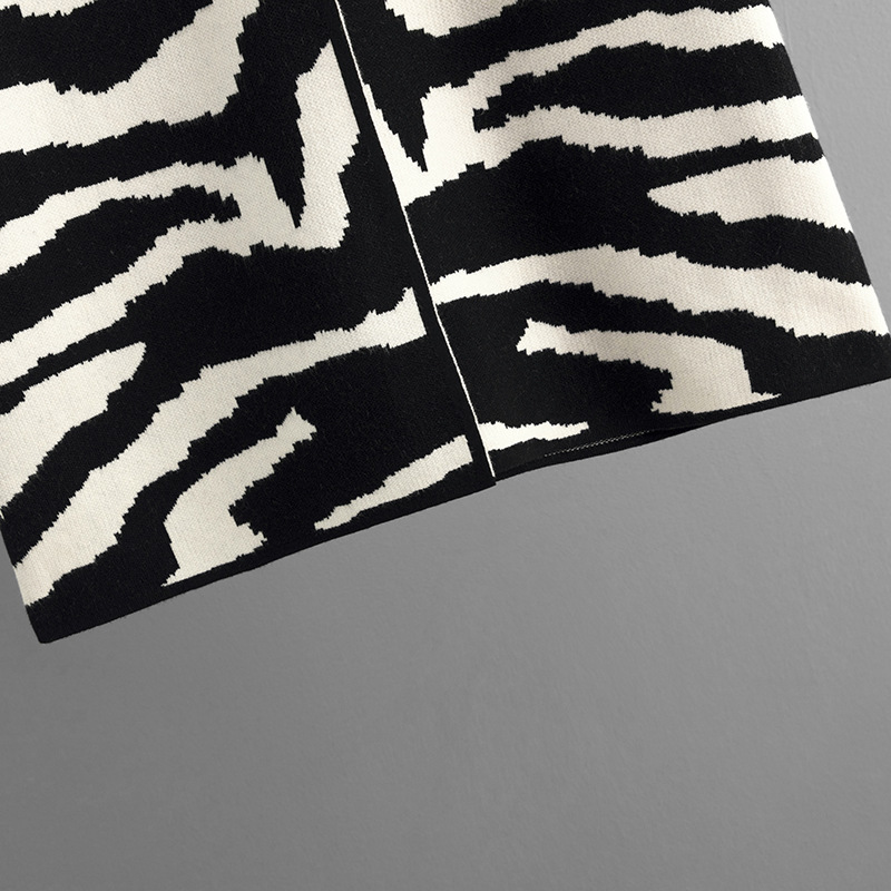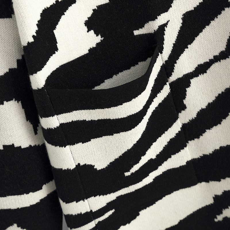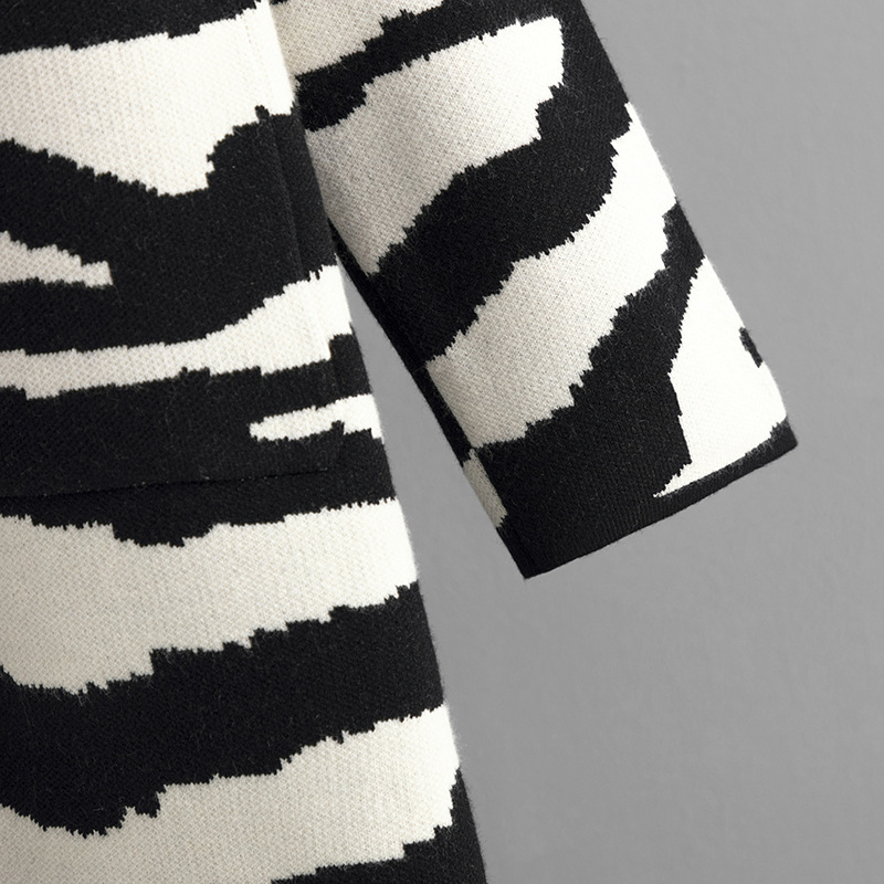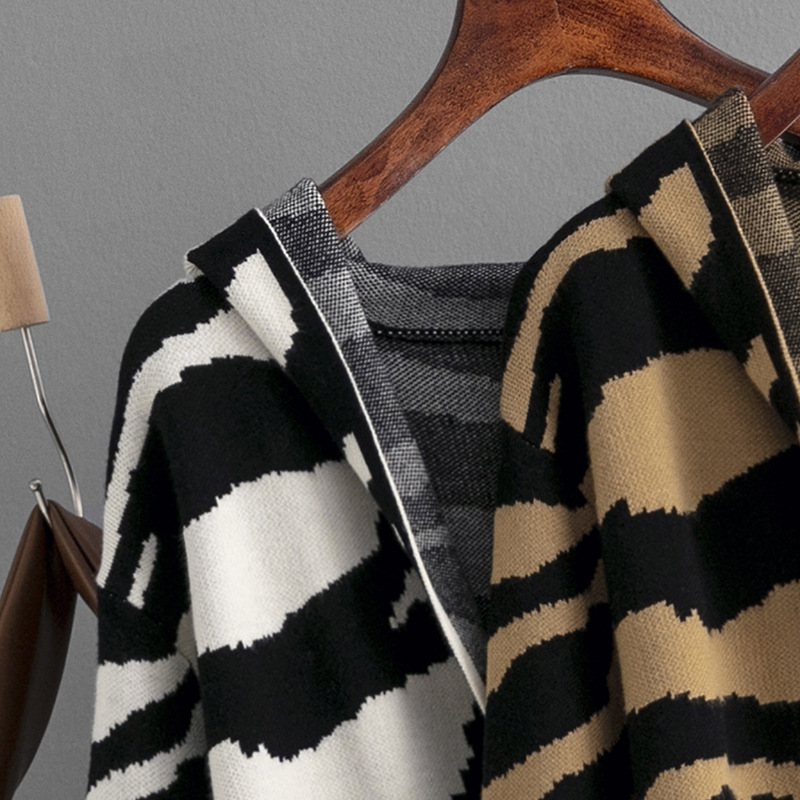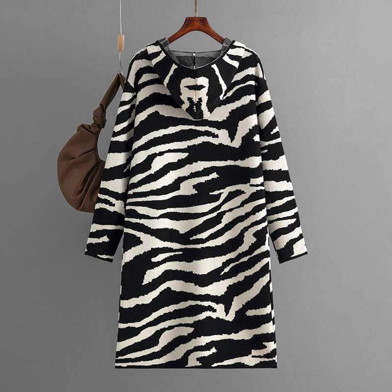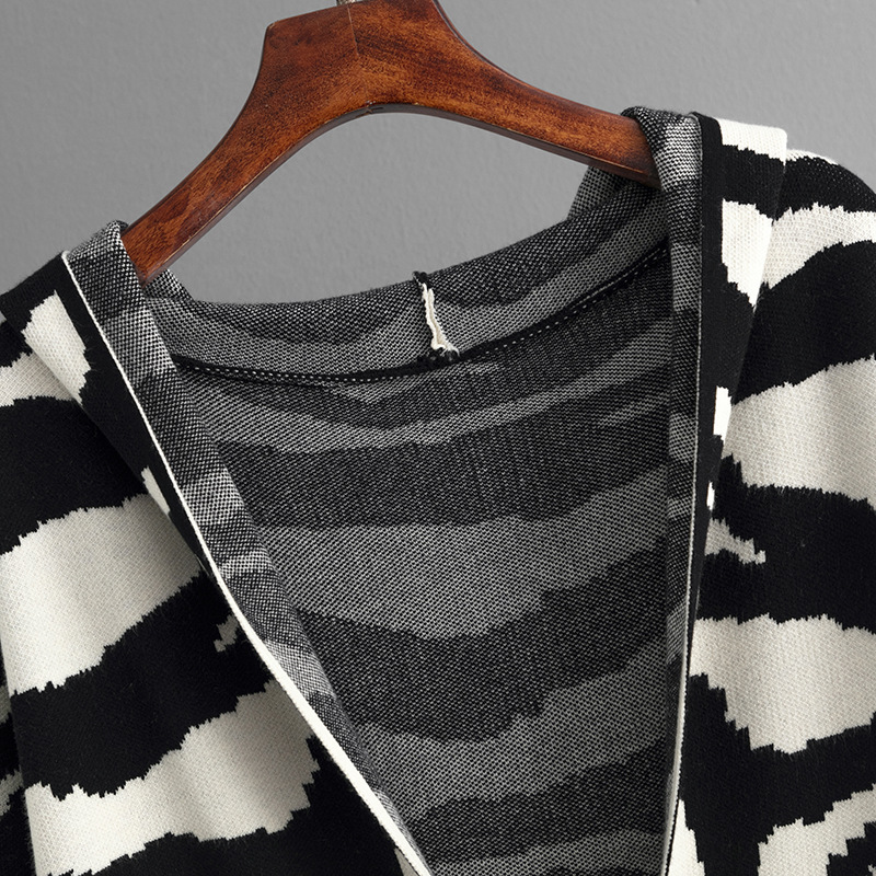Knitted Coat for Women Autumn Winter V neck Hooded Long Sleeve Zebra Pattern Long Sweater Cardigan