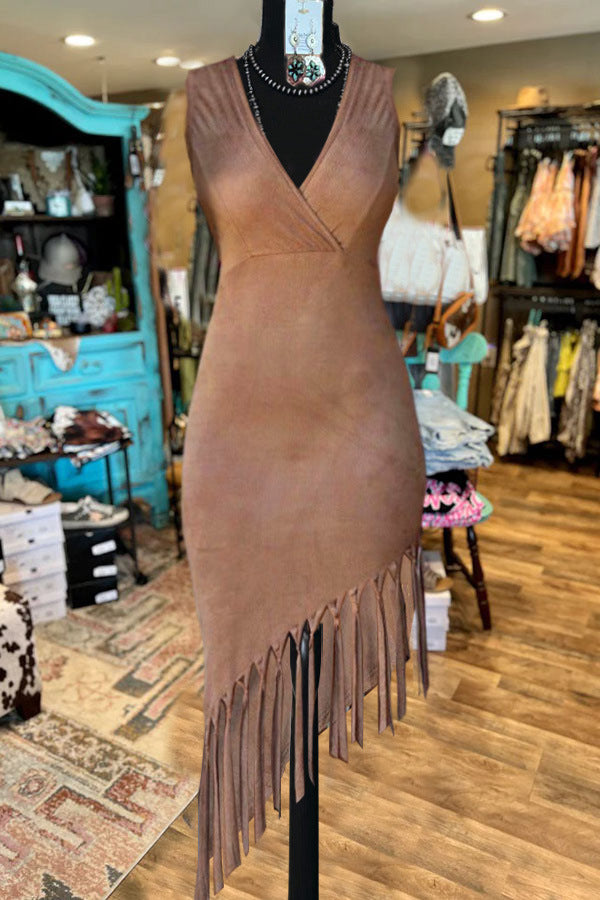 Ladies Party Dress Suede Tassel Hem V Neck Sleeveless Dress