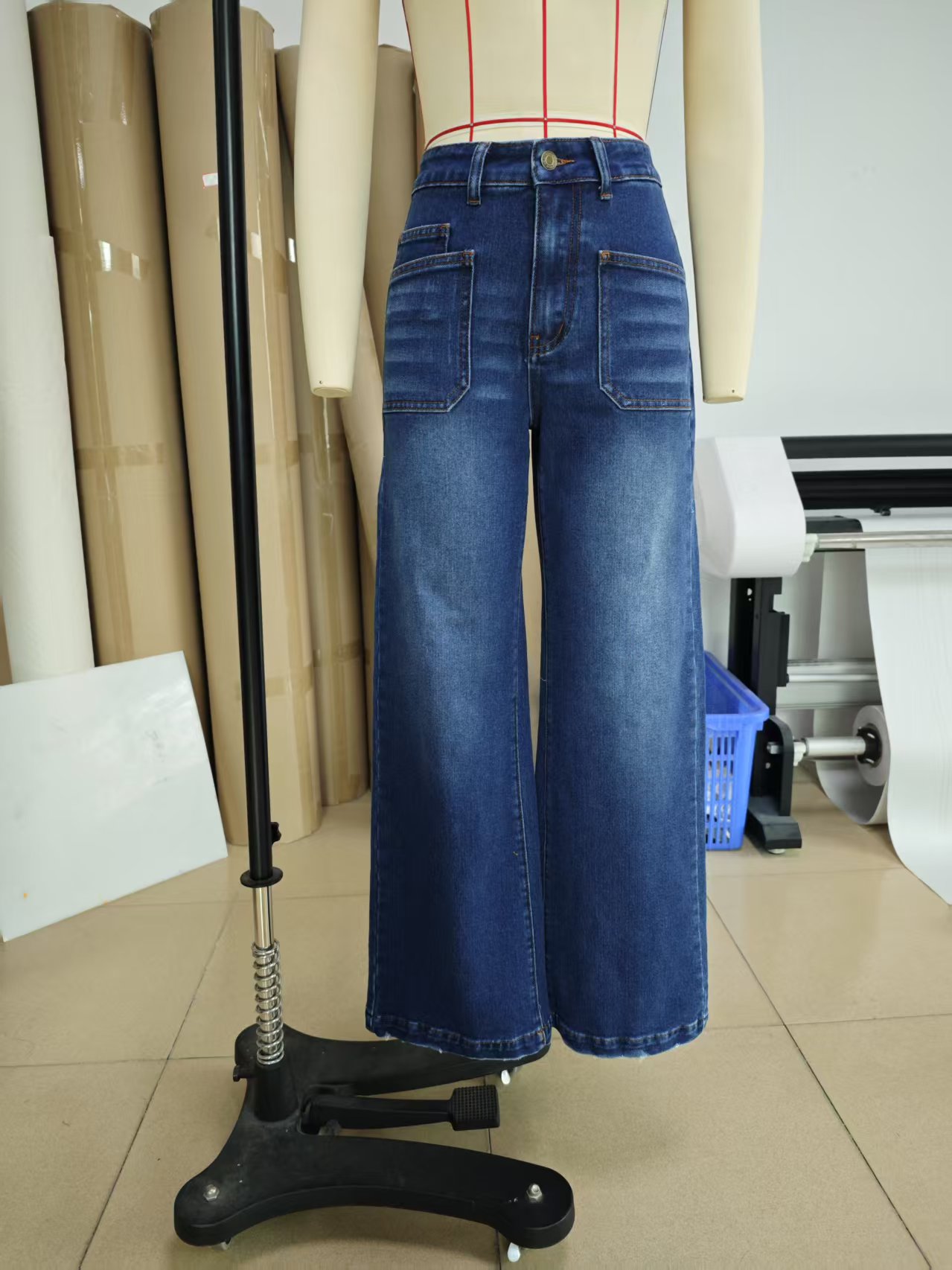 Ladies Stretch Outer Pocket Straight Wide Leg Denim Trousers