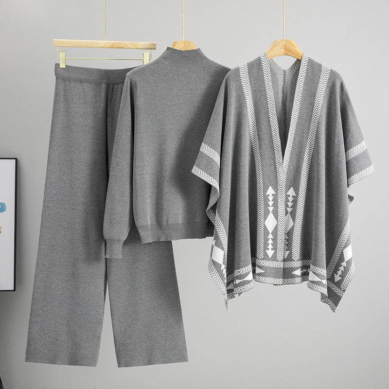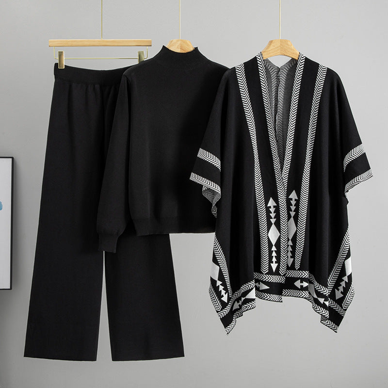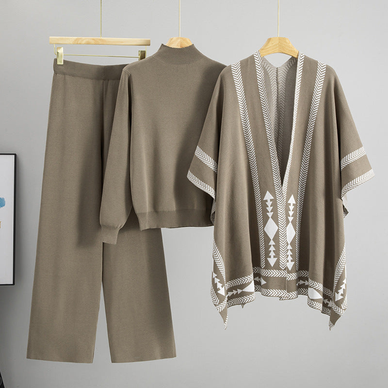 Lazy Wind Mid Collar Pullover Sweater Outer Wear Shawl Cape Coat Wide Leg Pants Three Pieces