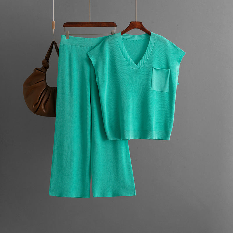 Loose Fashionable Knitted Women Solid Color V neck Knitted Top Casual Pants Two Piece Set