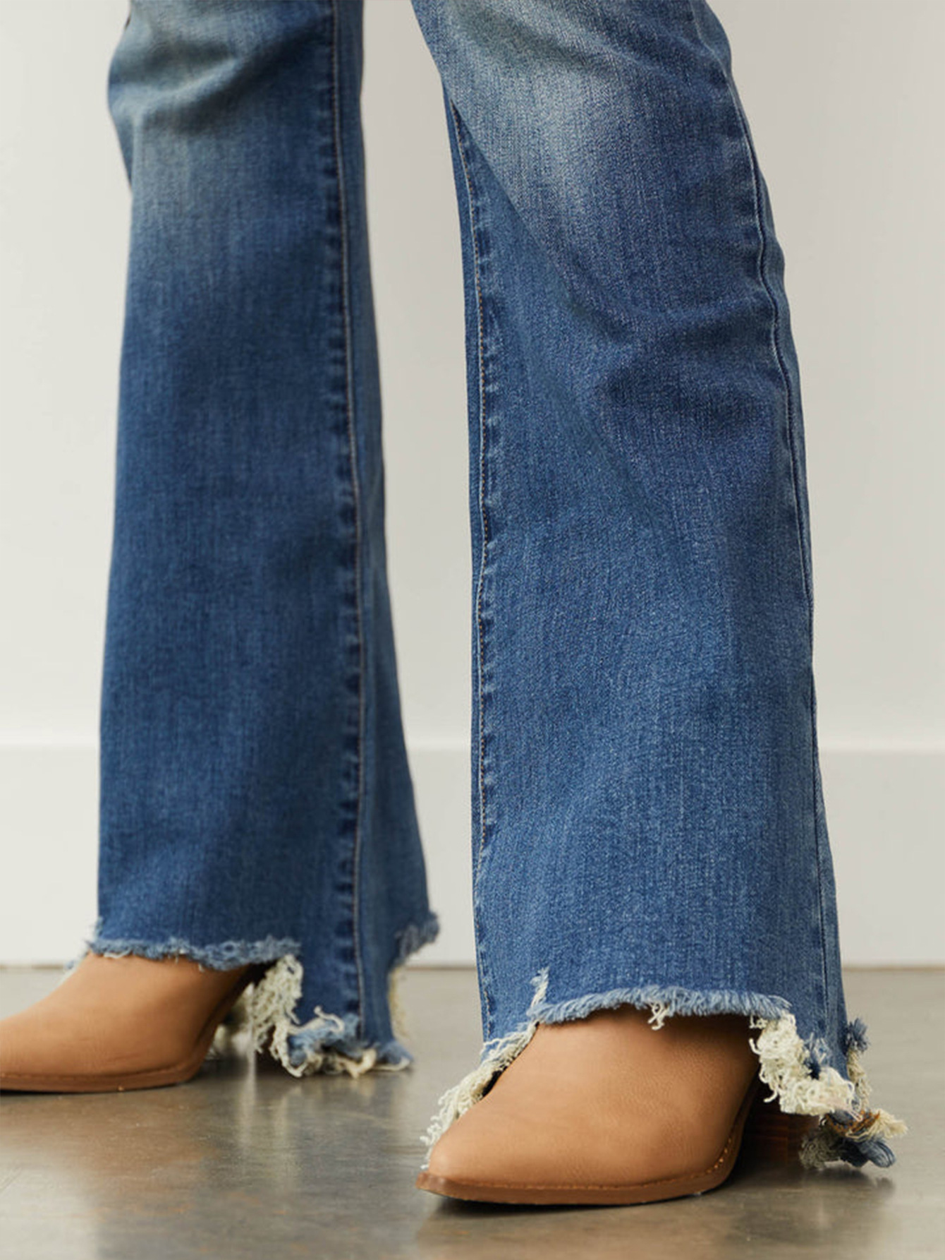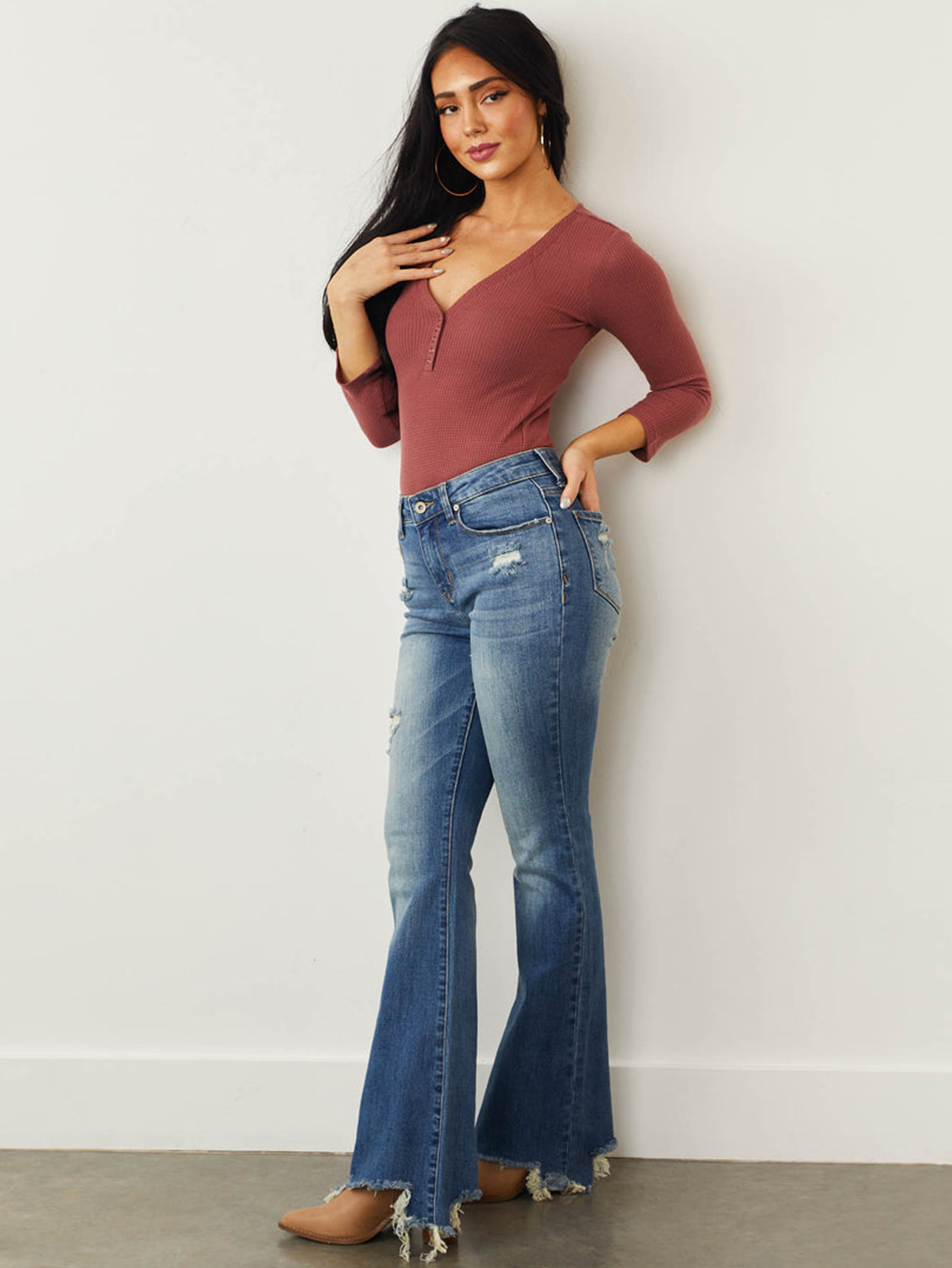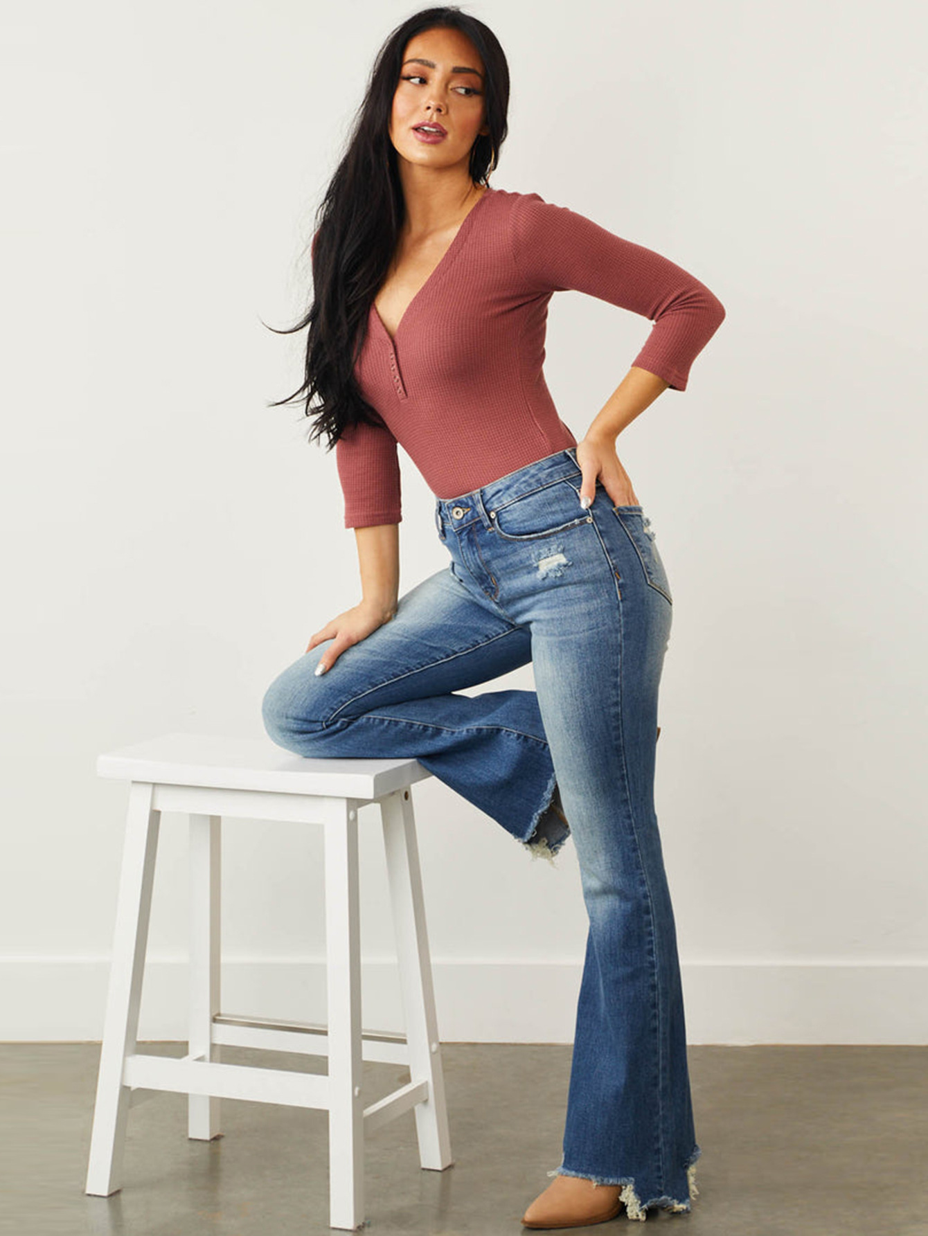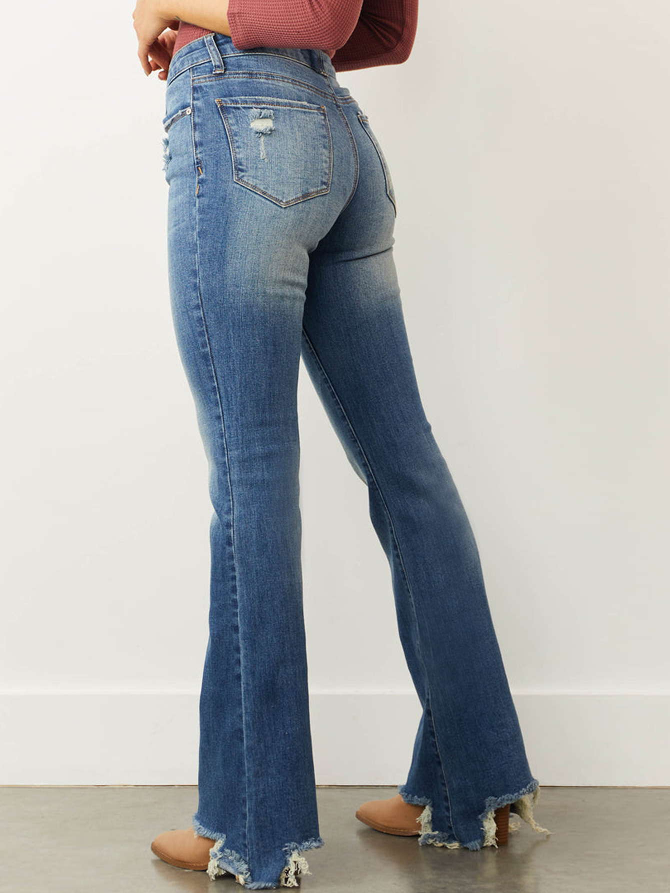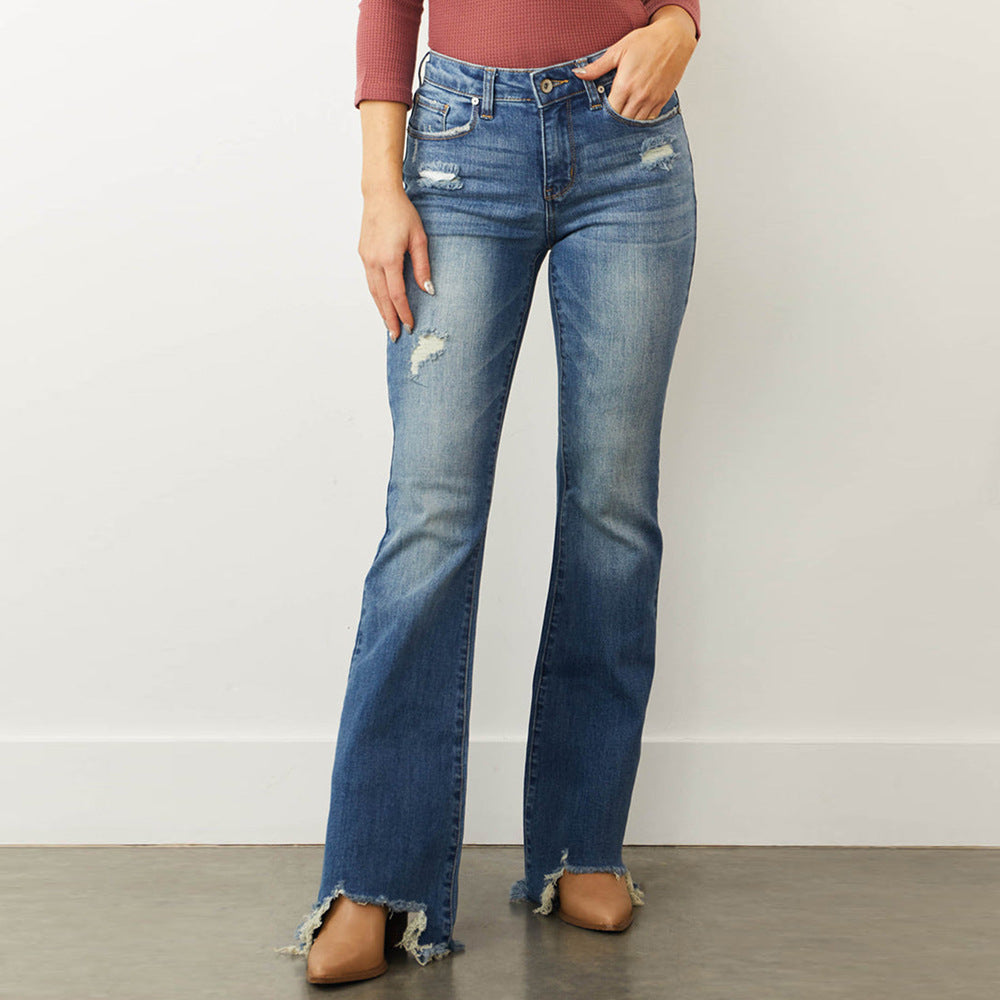 Mid Waist Slim Fit Stretch Holes Bell Bottom Pants Women Jeans