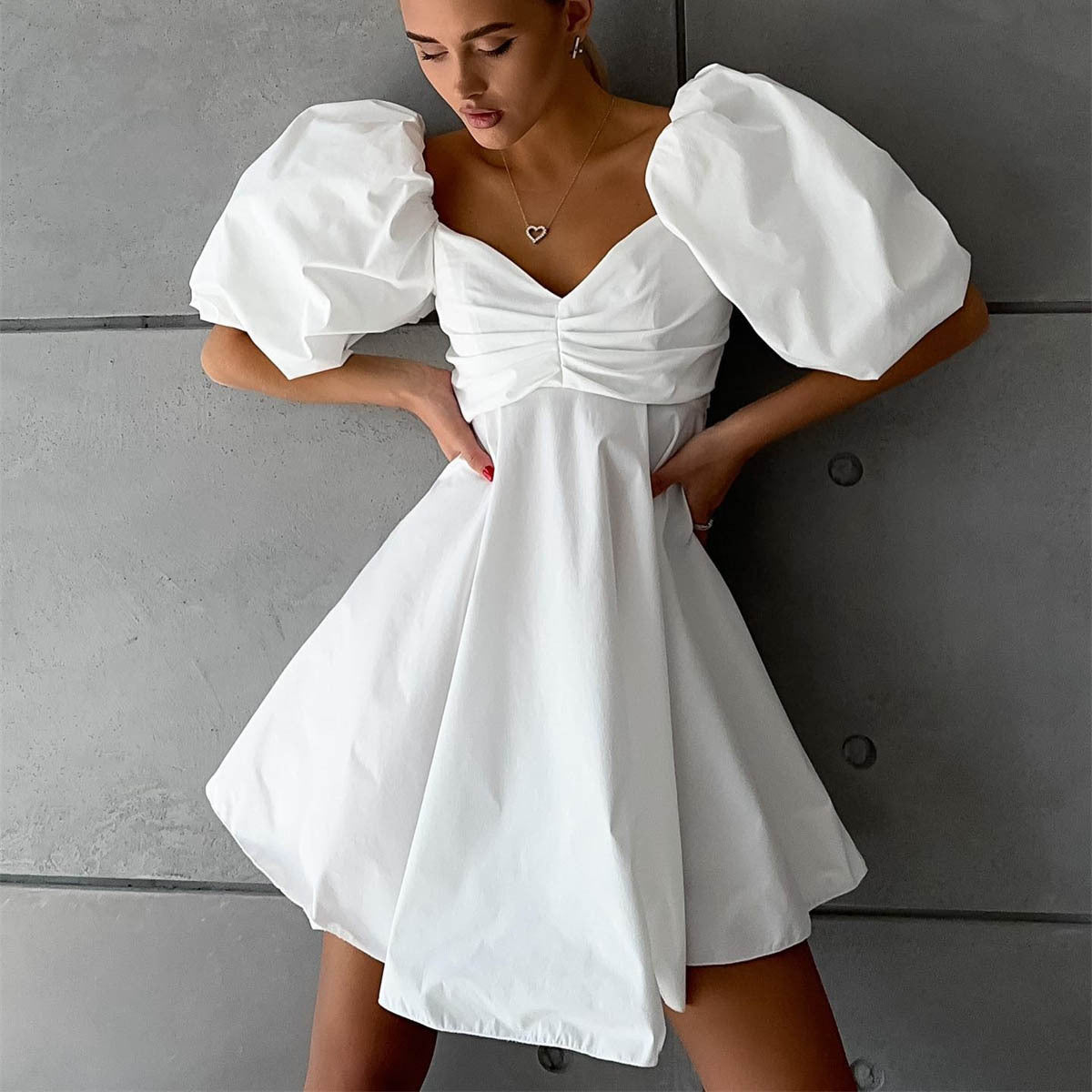Off Neck Short Dress for Women Summer Puff Sleeve High Waist A line Dress French Princess Dress for Women