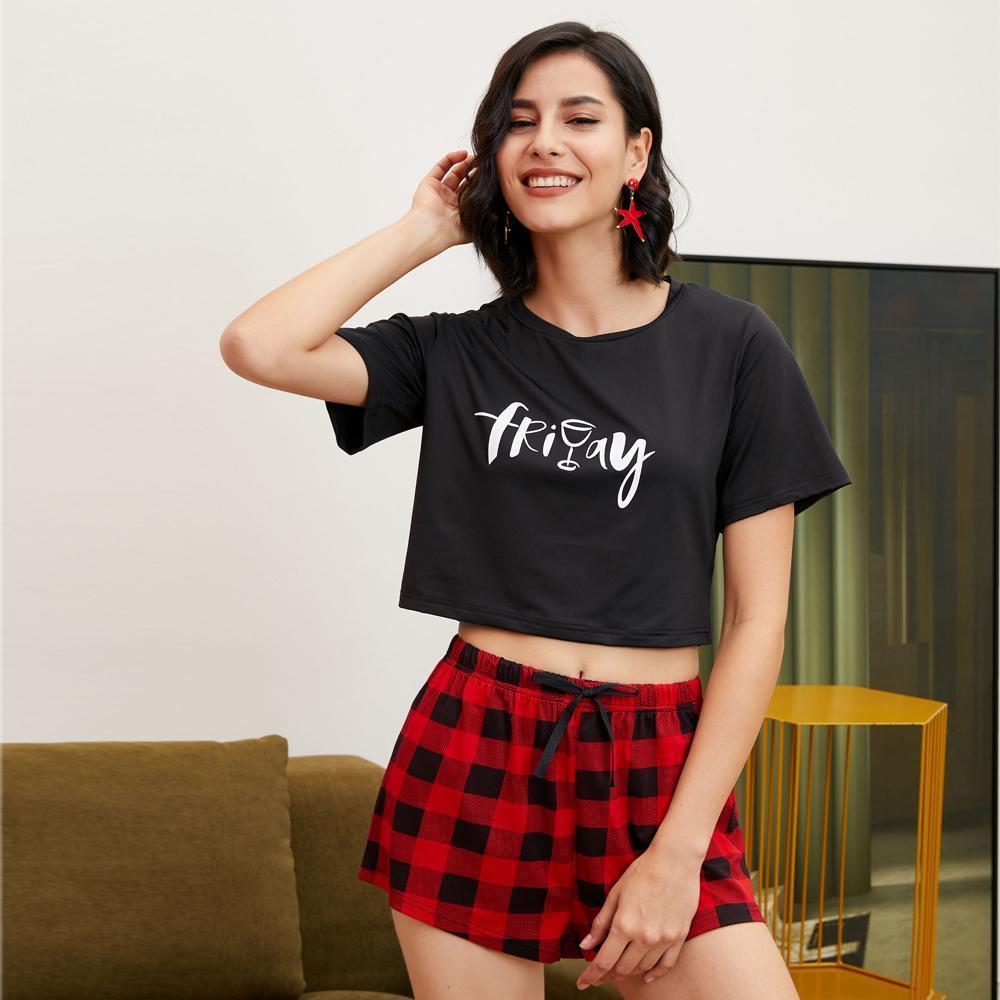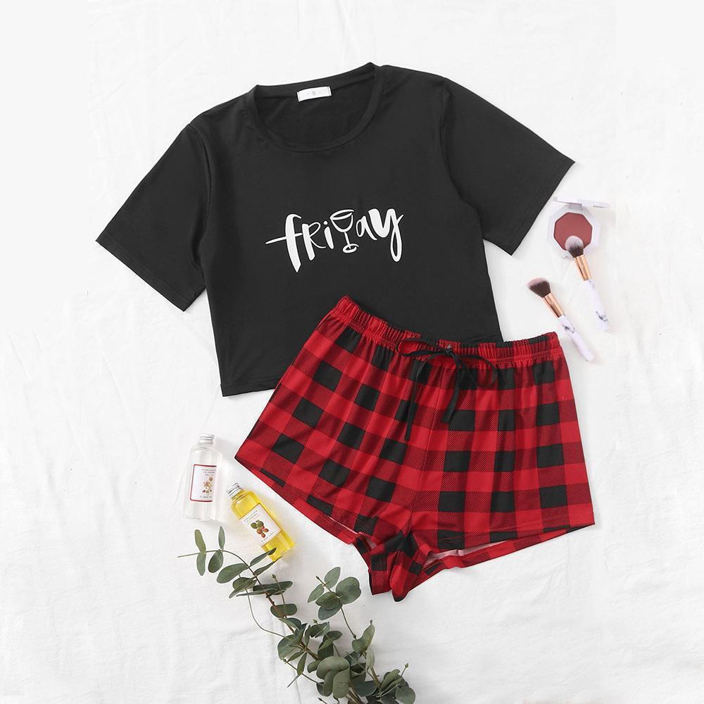 Pajamas Women Summer Plaid Short-Sleeved Homewear Suit