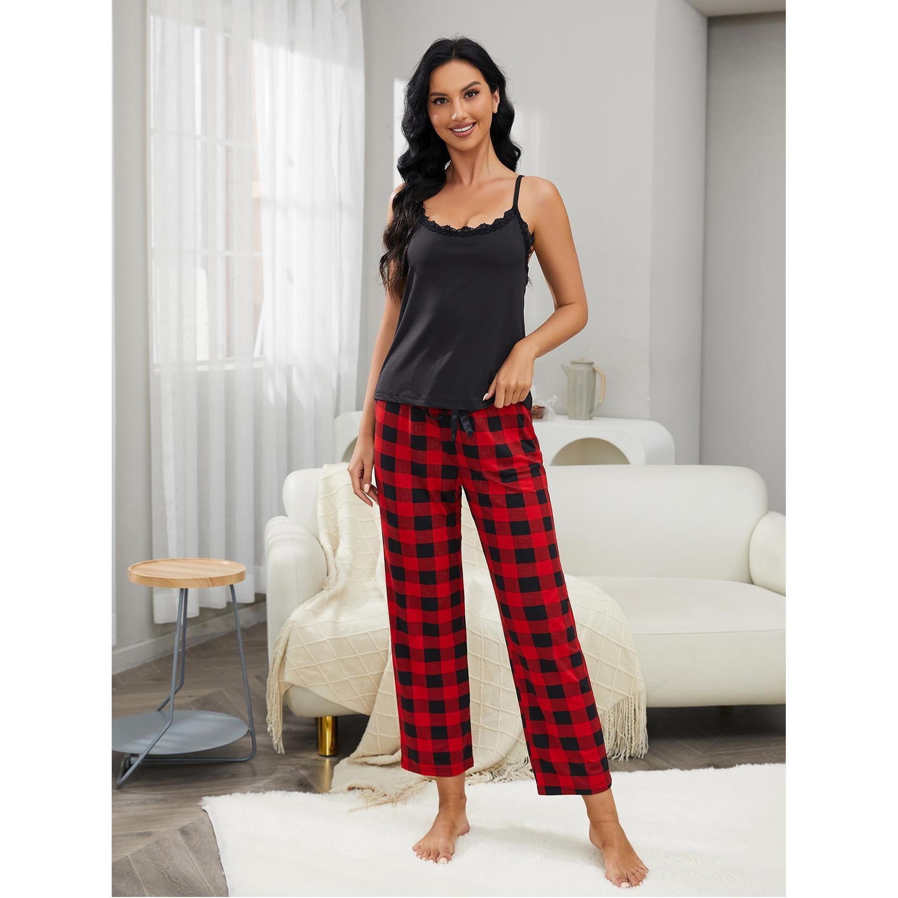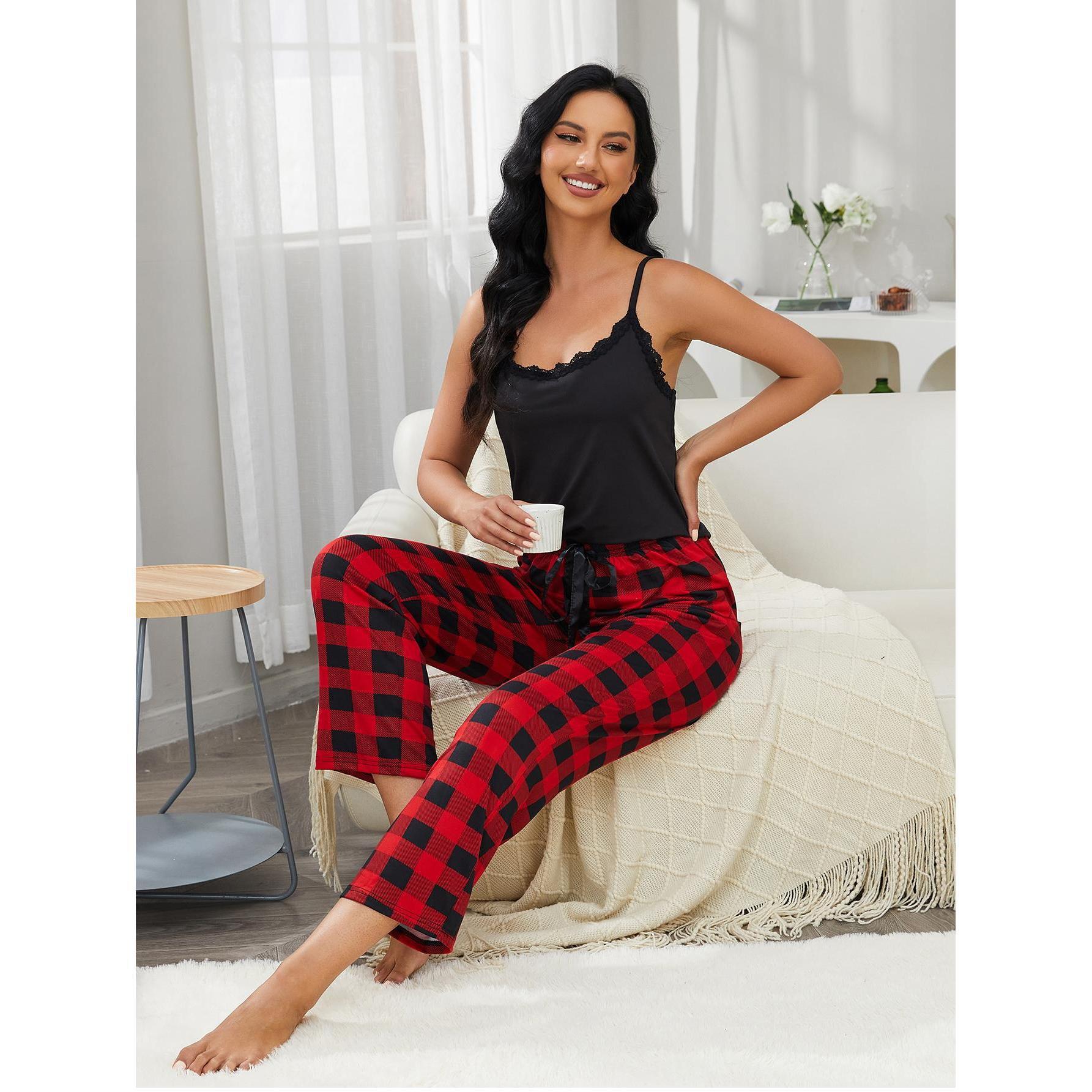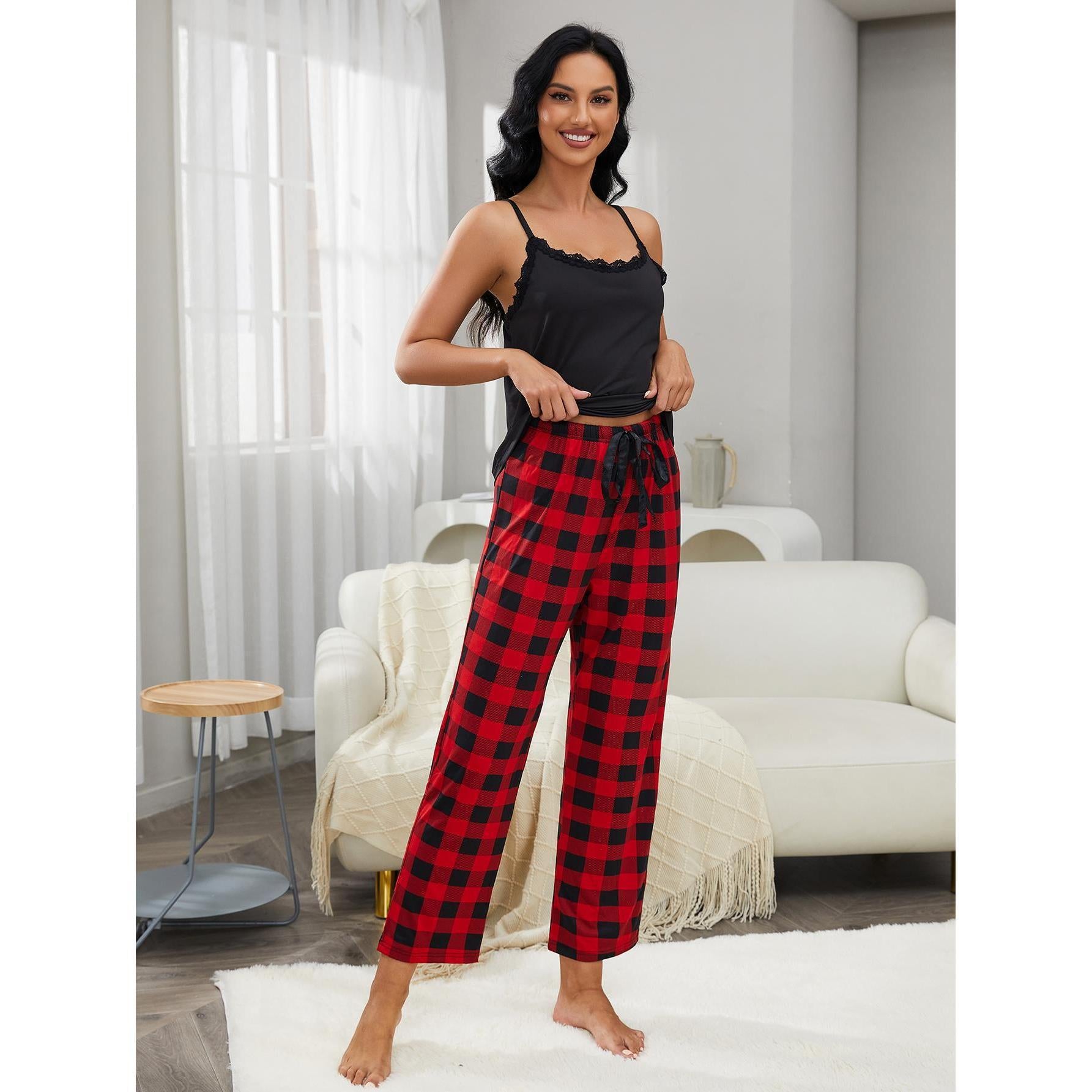 Pajamas Women Summer Suspender Plaid Trousers Home Wear Suit Meike