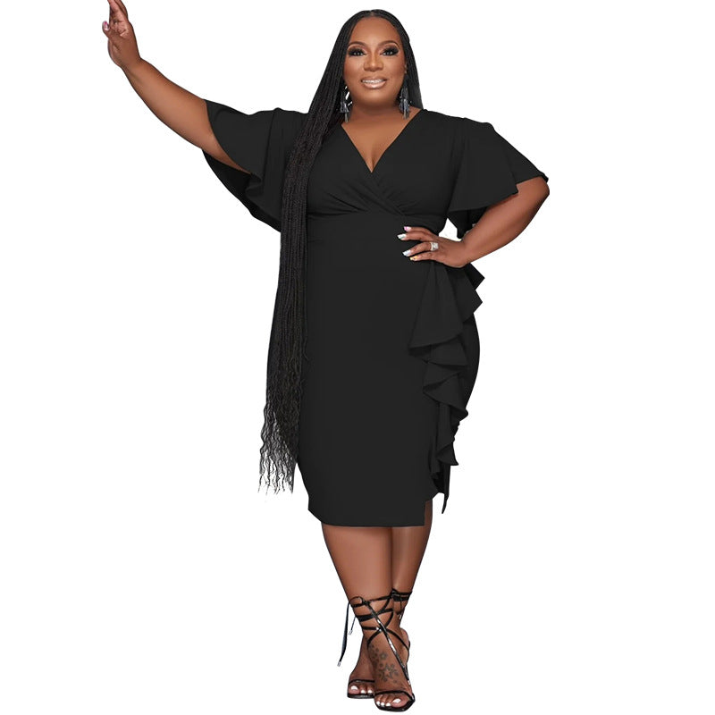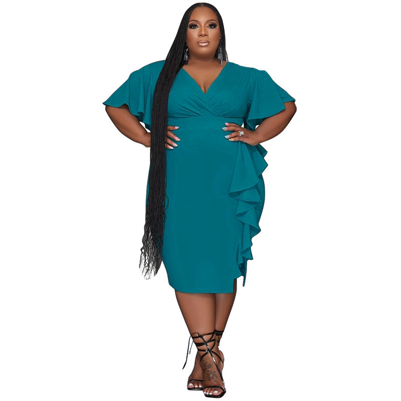 Plus Size Elegant Women Clothing Solid Color V neck Ruffled Slim Fit Sexy Dress