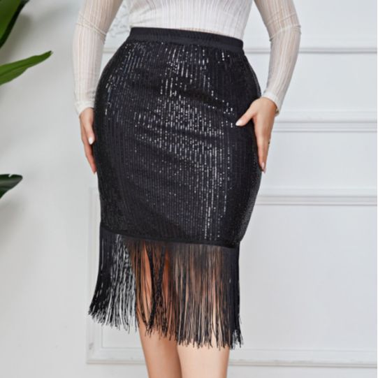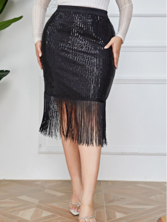 Plus Size High Waist Retro Office Sheath Sequined Tassel Skirt