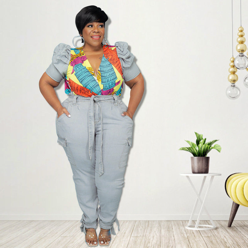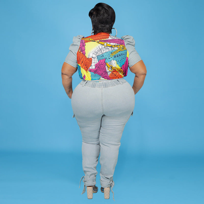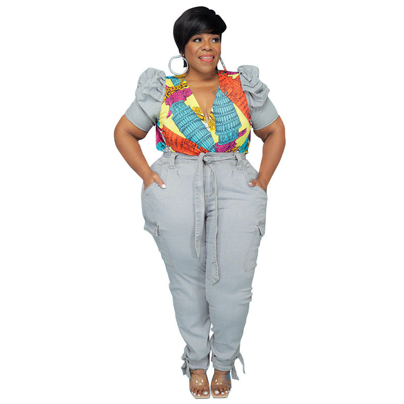 Plus Size New Autumn Jeans Printed Puff Sleeve Women Suit
