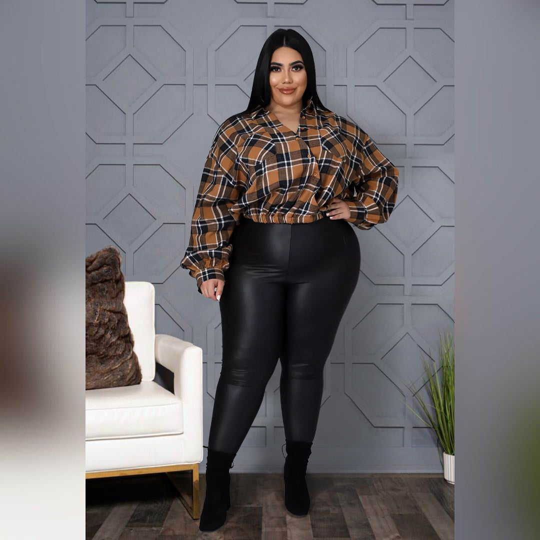 Plus Size Nightclub Uniforms Asymmetric Drop Shoulder Pocket Cotton Plaid Top