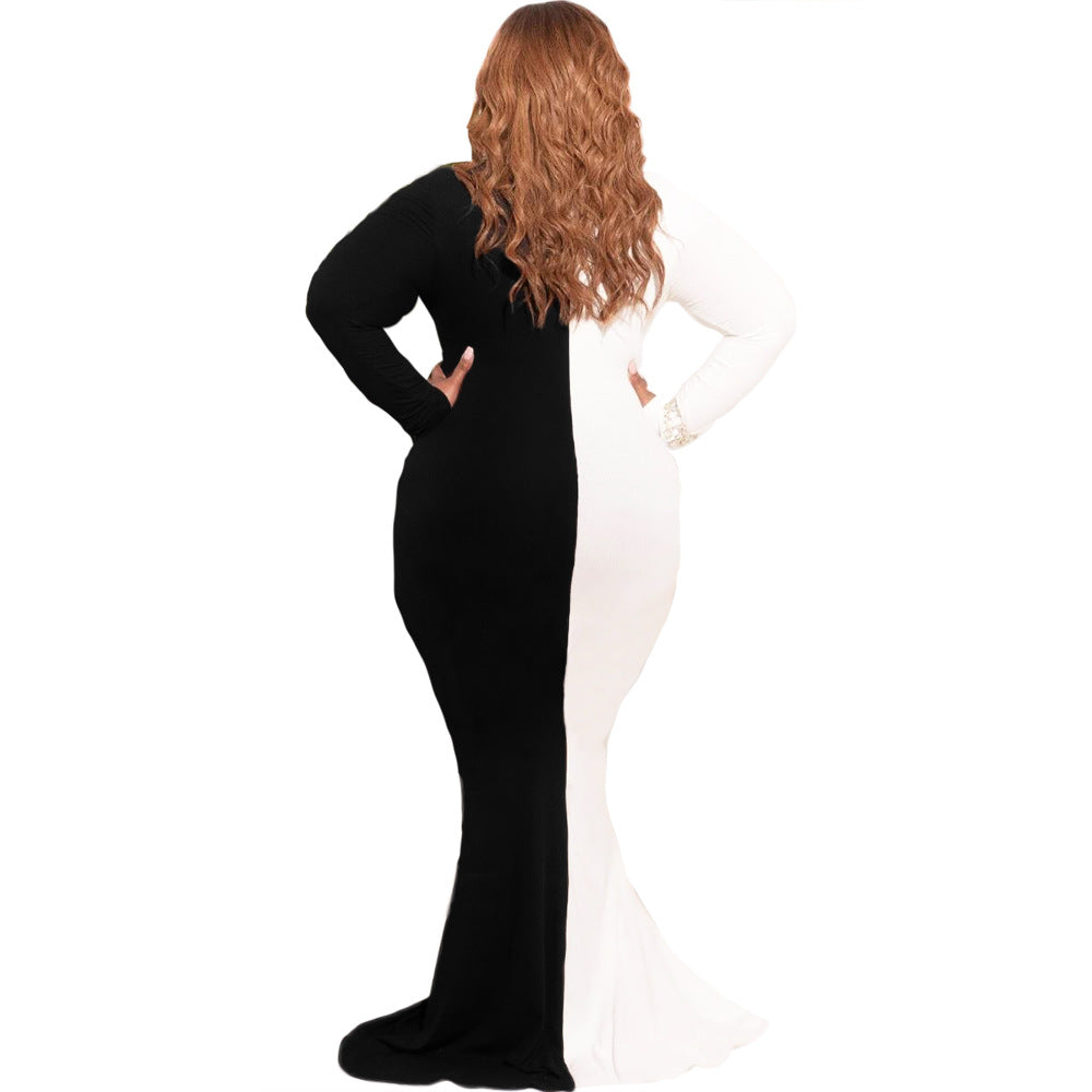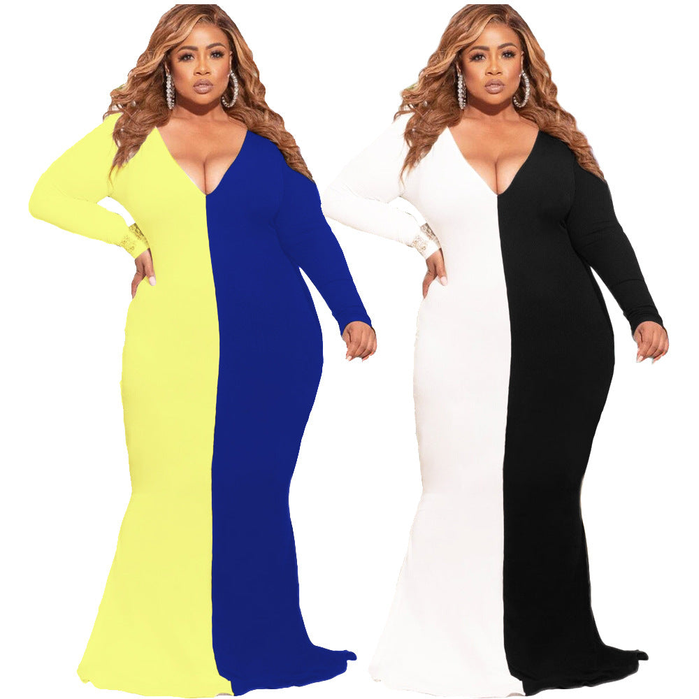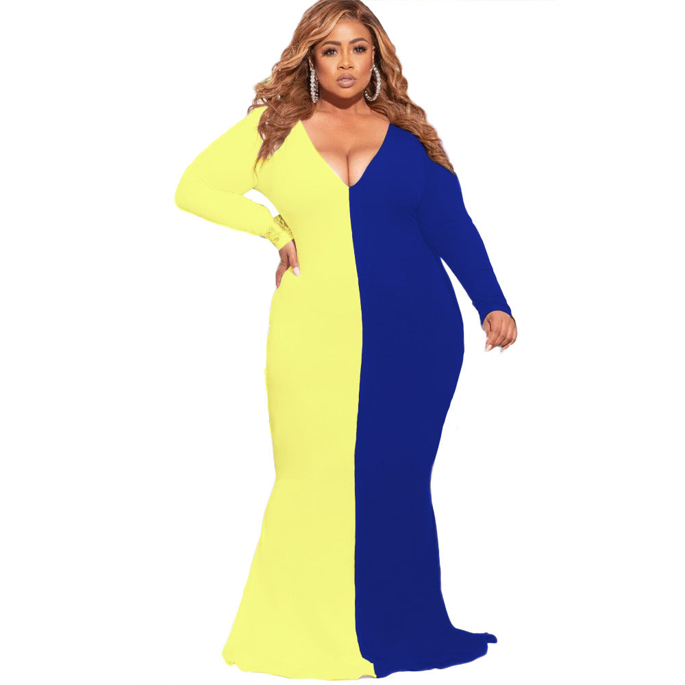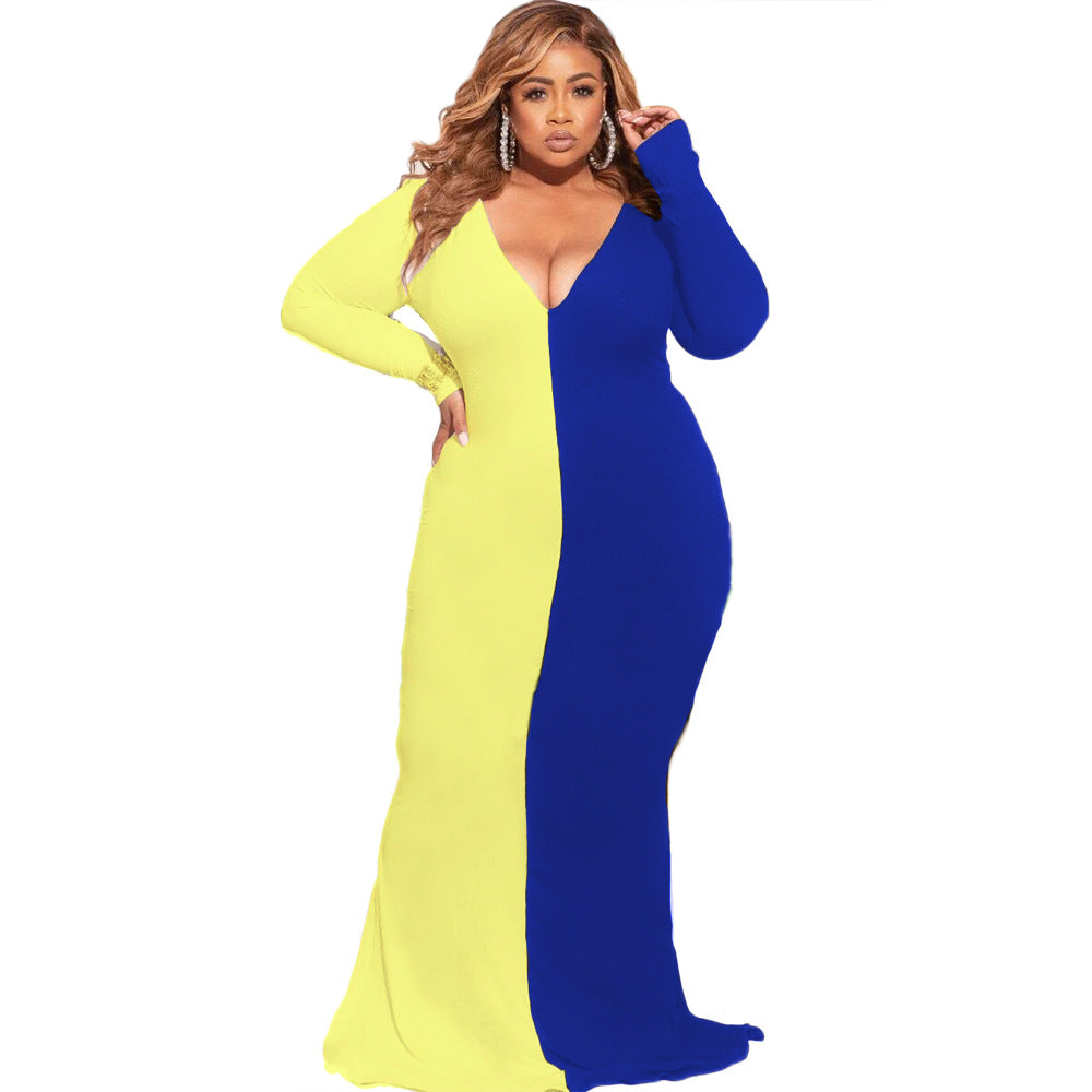 Plus Size Plus Size Color Contrast Patchwork V-neck Slim-Fit Long Sleeve Women Maxi Dress