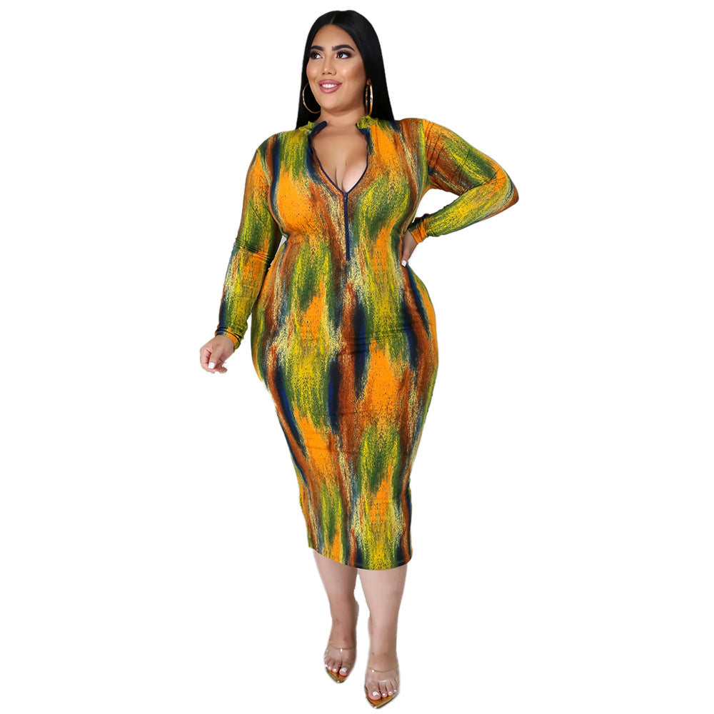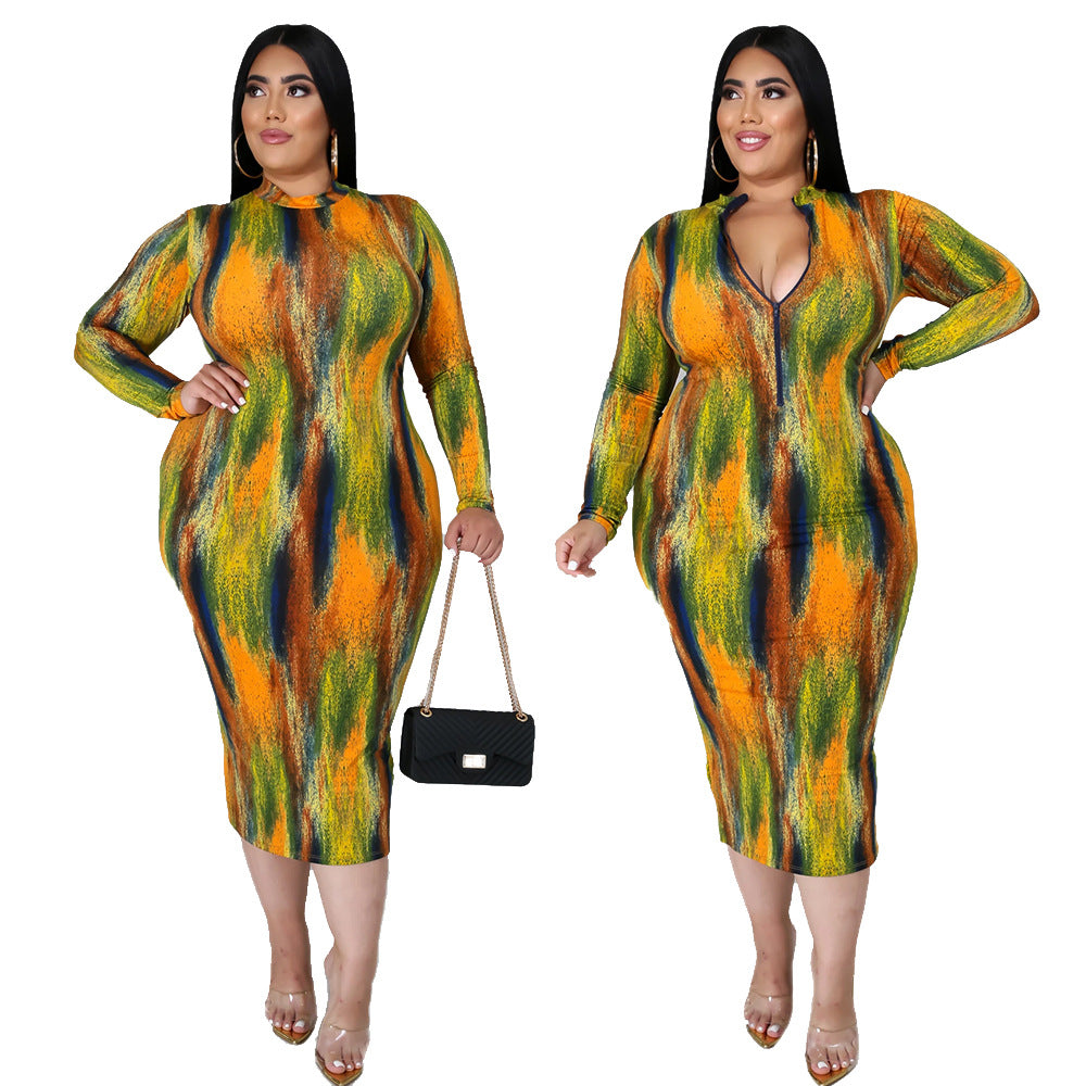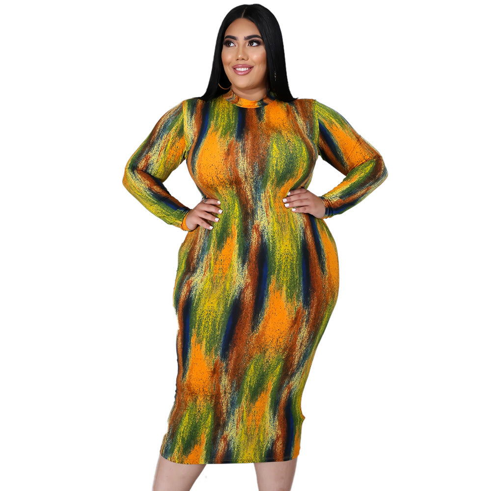 Plus Size Plus Size Sexy Women Wear Turtleneck Long Sleeve Slim Tie-Dye Printed Midi Dress for Women