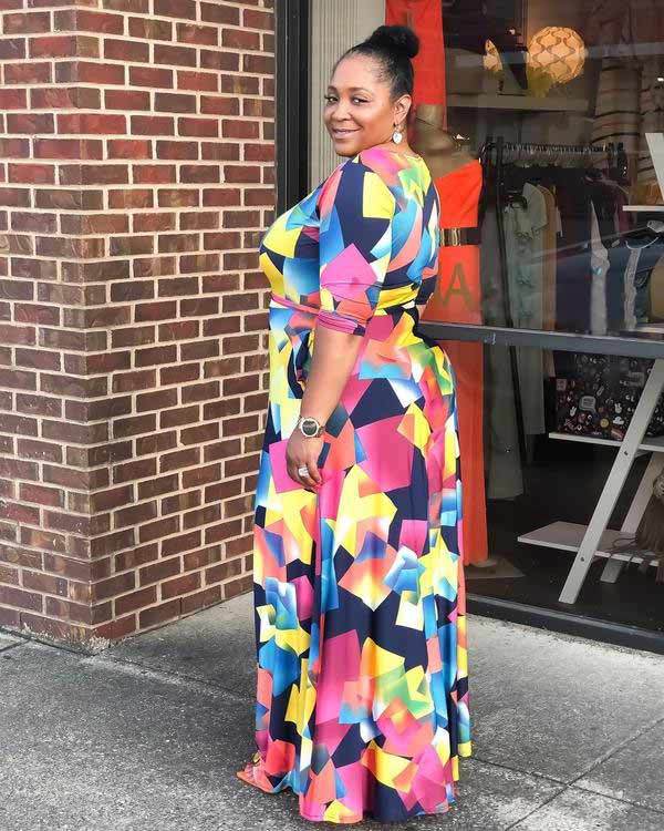 Plus Size Popular Classic Color Matching Printed Waist Controlled Sexy V Neck Large Swing Dress Belted