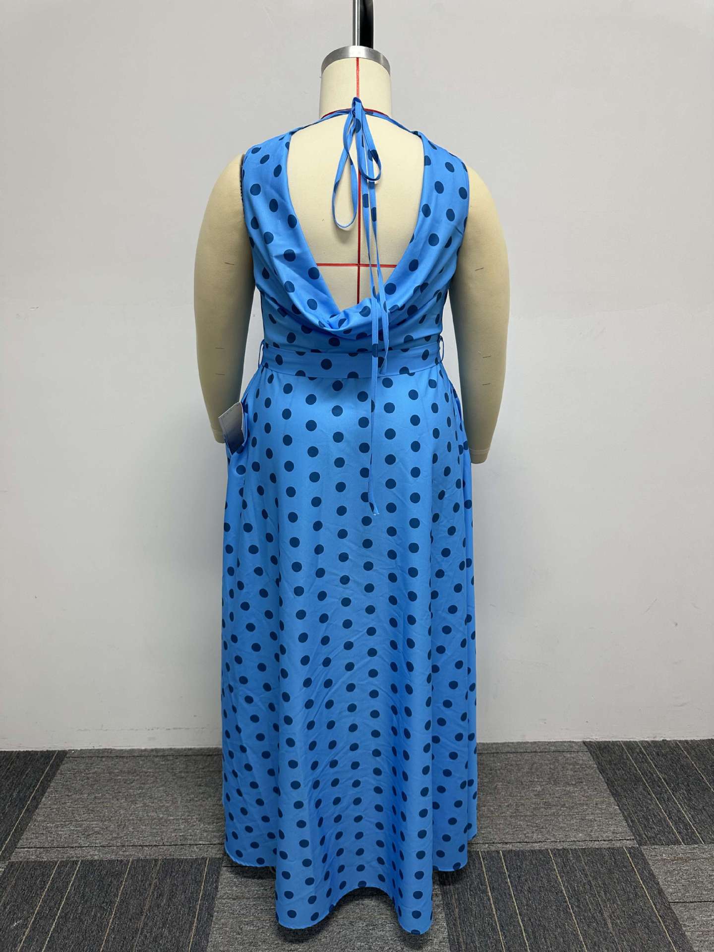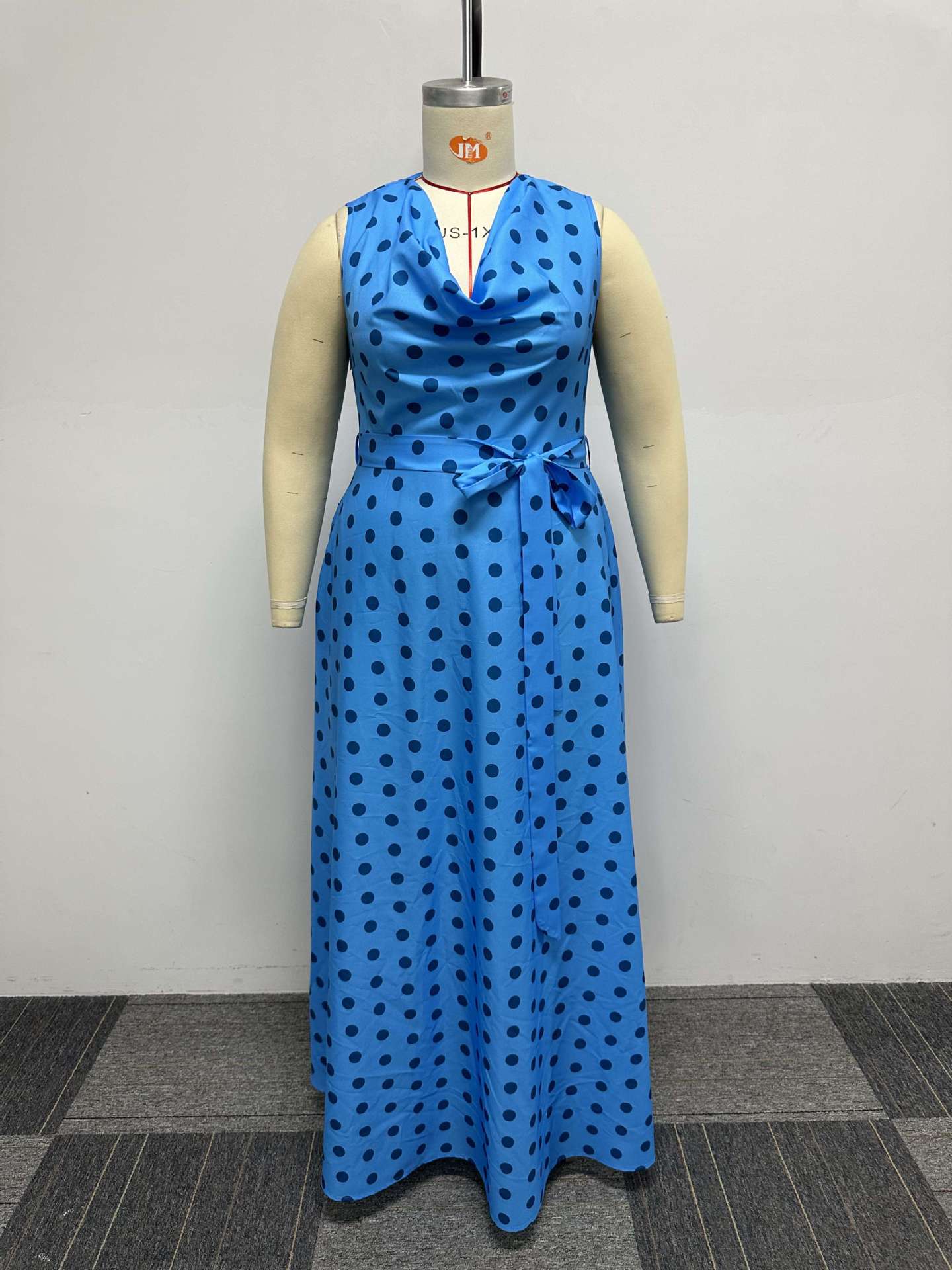 Plus Size Sexy Slim Fit Polka Dot Printed Lace Up Waist Controlled Pleated Mop Dress