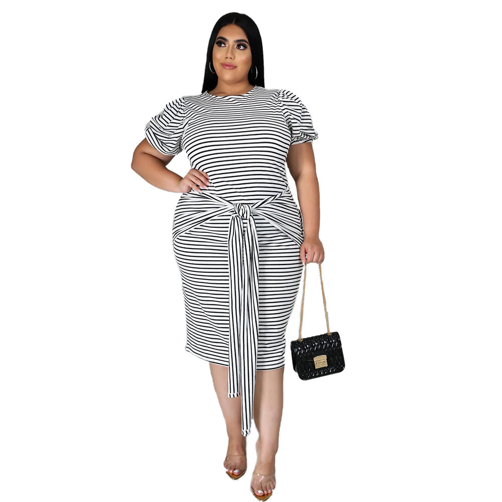 Plus Size Sexy Women Wear round Neck Striped Short Sleeve Lace-up Women Casual Dress