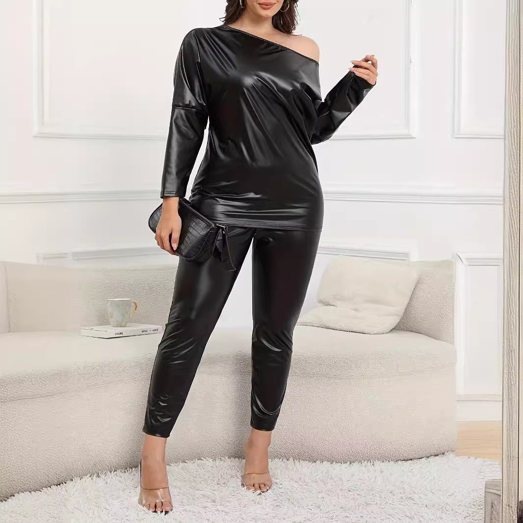 Plus Size Solid Color off Neck Women Slim Fit Leather Coat Set