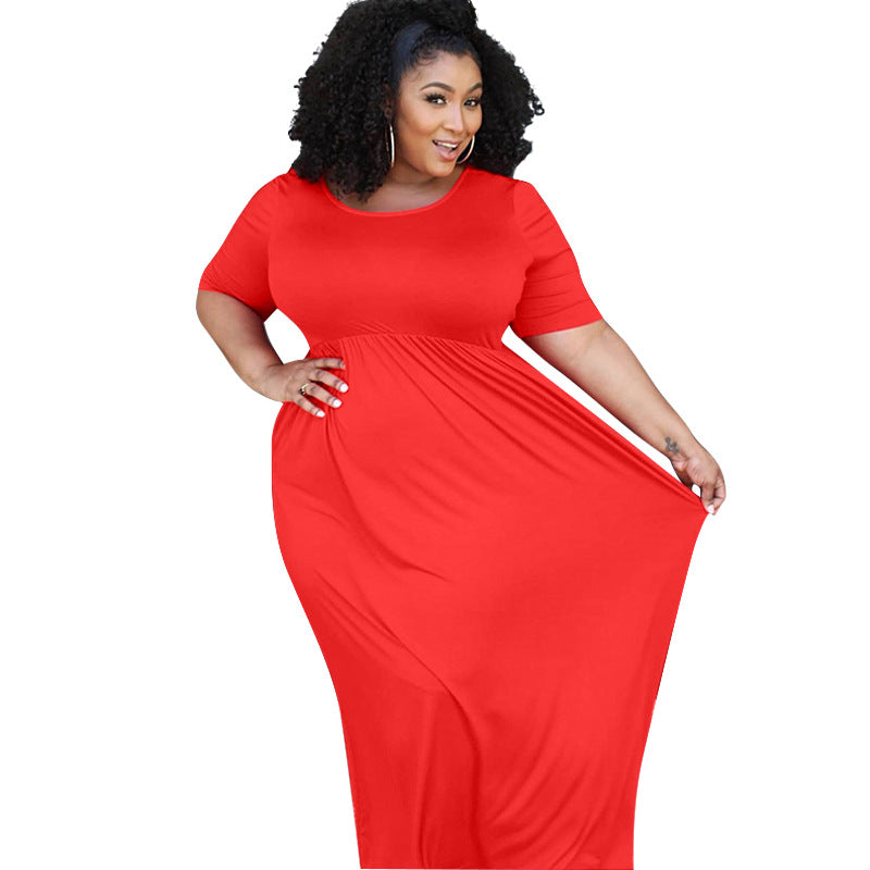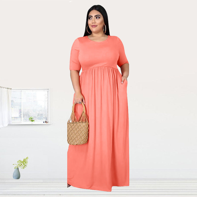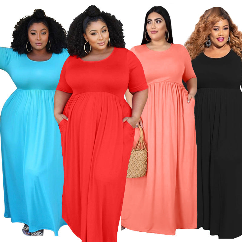 Plus Size Solid Color Pleating Large Swing Short Sleeve Long Pattern Dress